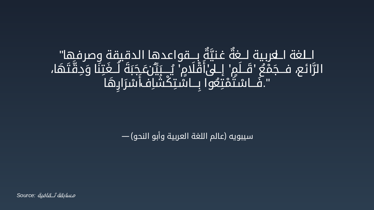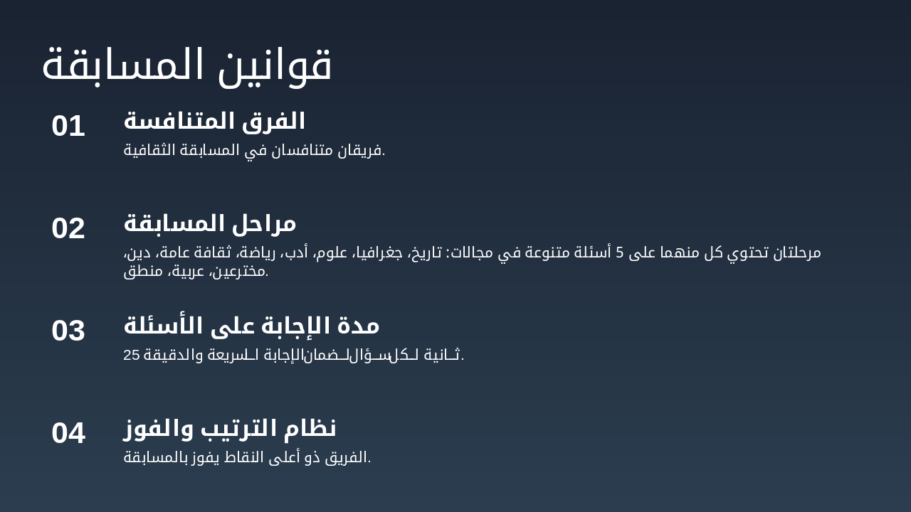 The slide outlines rules for a cultural competition between two teams across two stages, each with five diverse questions on topics like history, geography, sciences, literature, sports, general culture, religion, inventors, Arabic, and logic. Each question allows 25 seconds for a quick and accurate answer, with the highest-scoring team winning.