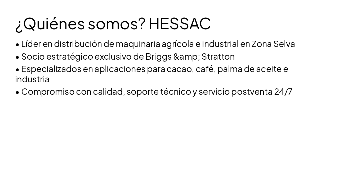 Presentación para nuevos distribuidores sobre HESSAC, líder en maquinaria agrícola e industrial en Zona Selva y socio exclusivo de Briggs & Stratton. Destaca series Vanguard y XR, aplicaciones en cacao, café y palma, oportunidades de mercado, Ventas,