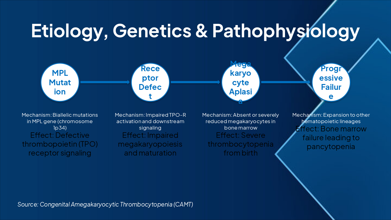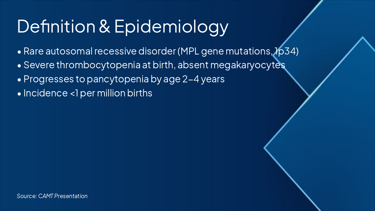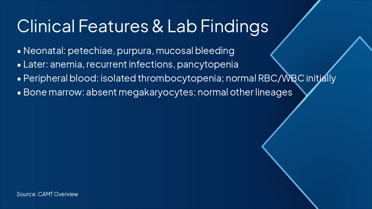 Diff dx vs ITP/TAR: table (CAMT: no megas, AR). Mgmt: Platelets/supportive; HSCT curative. Prognosis: Poor w/o HSCT (marrow failure); good post-HSCT.