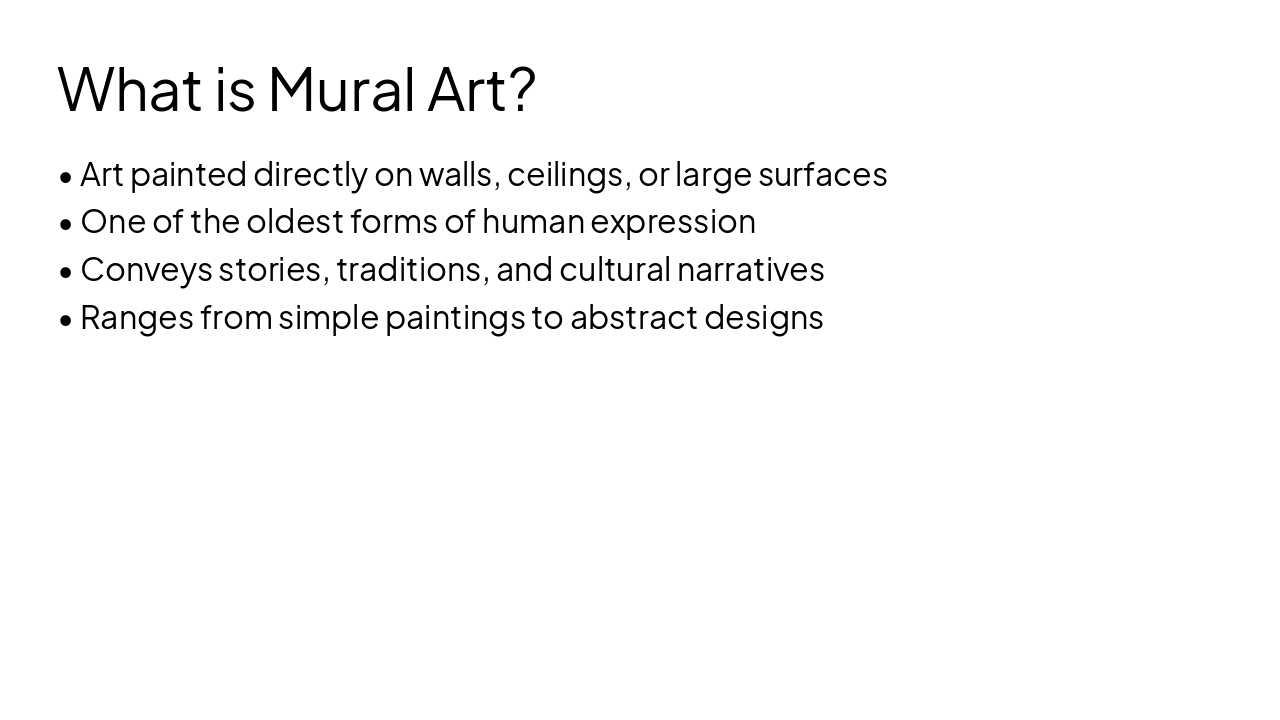 Mural art is artwork painted directly on walls, ceilings, or large surfaces, ranging from simple paintings to abstract designs. As one of the oldest forms of human expression, it conveys stories, traditions, and cultural narratives.