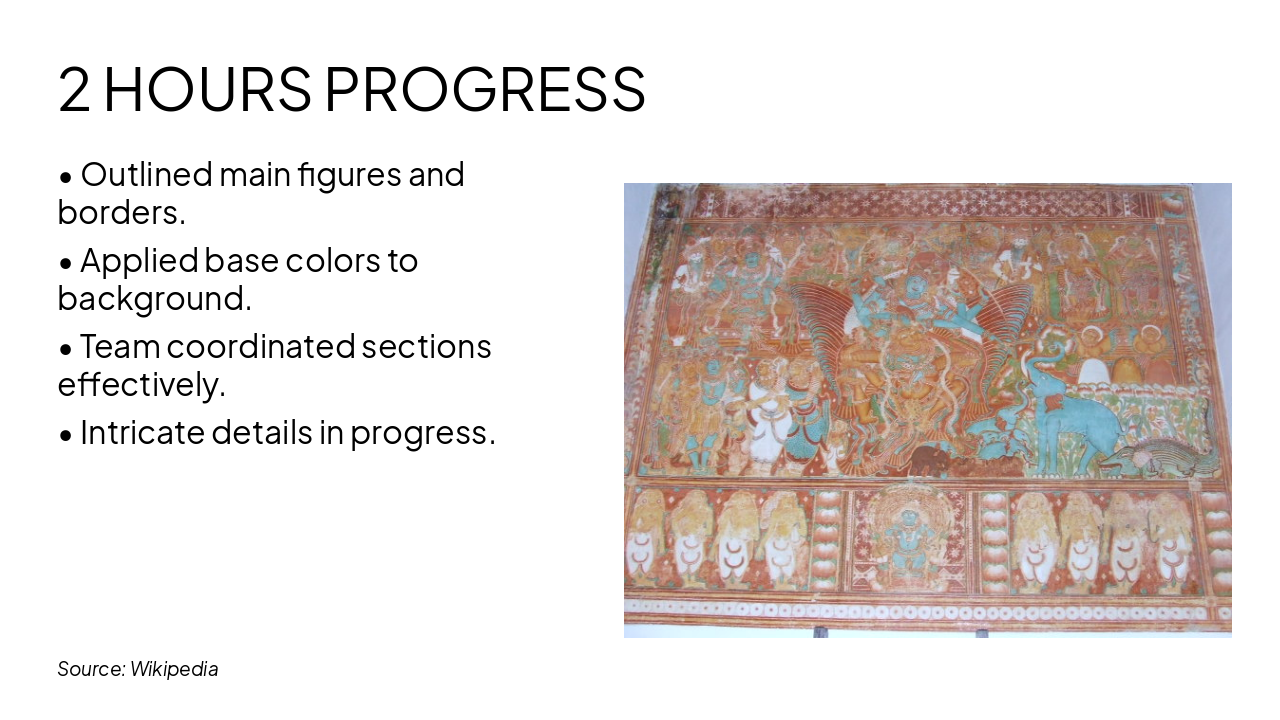 This slide, titled "2 HOURS PROGRESS," outlines main figures and borders while applying base colors to the background. The team coordinated sections effectively, with intricate details now in progress.