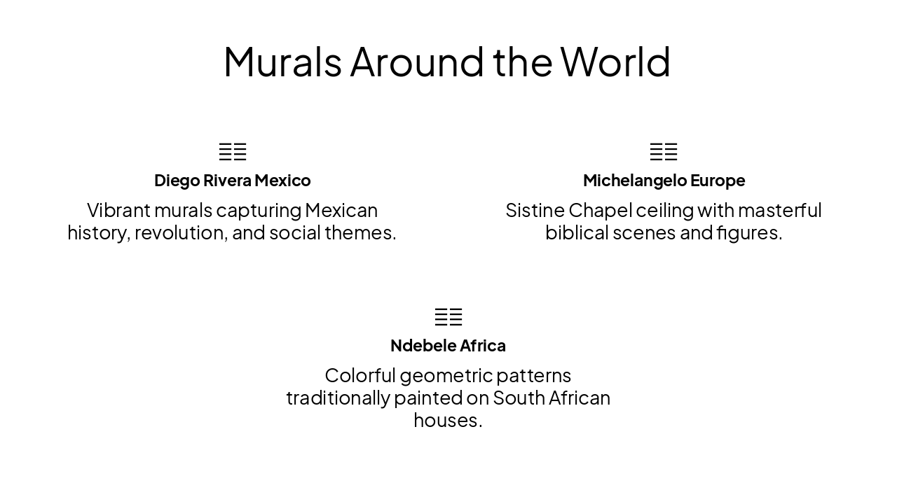 The "Murals Around the World" feature grid showcases three iconic examples from different regions. It highlights Diego Rivera's vibrant Mexican murals on history and revolution, Michelangelo's Sistine Chapel ceiling with biblical scenes in Europe, and Ndebele's colorful geometric house patterns in South Africa.