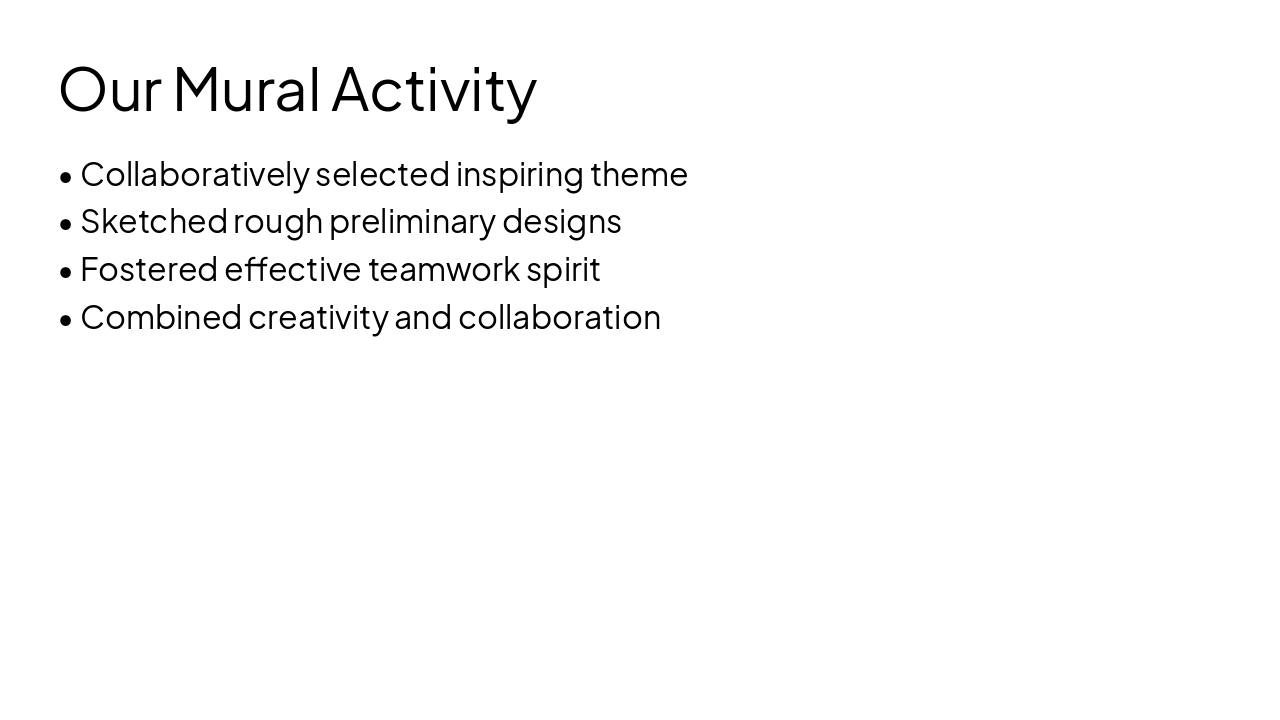 In the "Our Mural Activity" slide, participants collaboratively selected an inspiring theme and sketched rough preliminary designs. The activity fostered effective teamwork while combining creativity and collaboration.