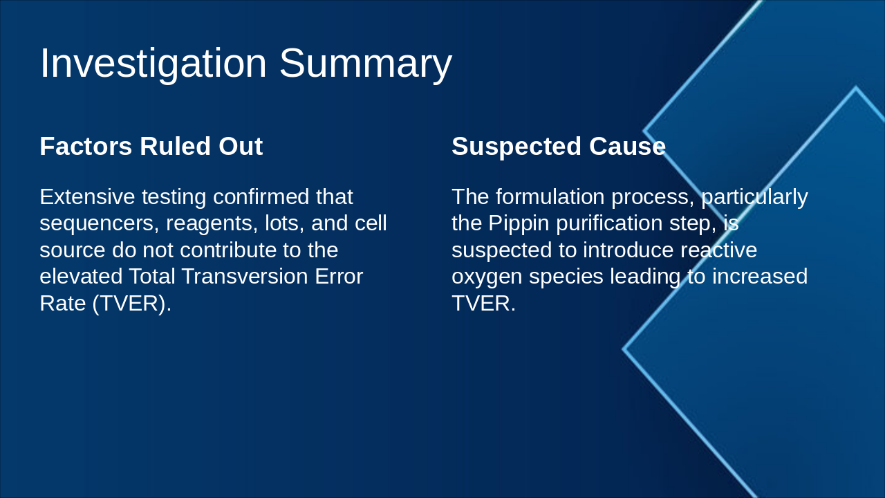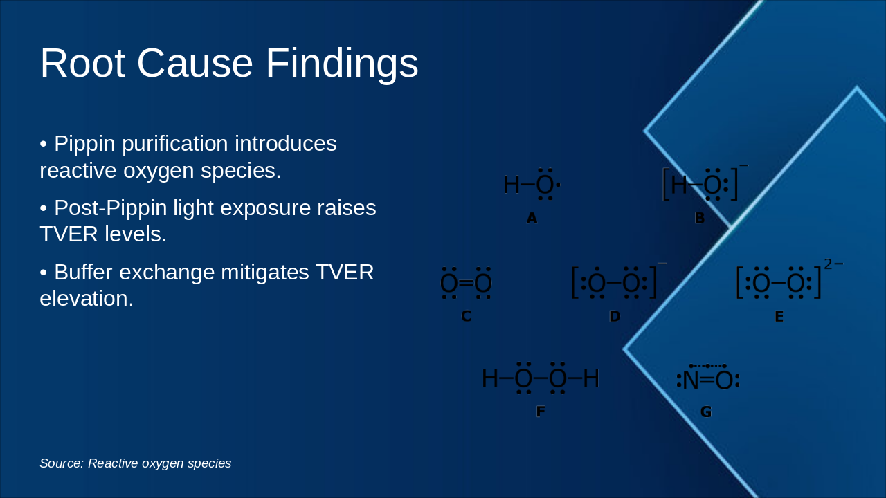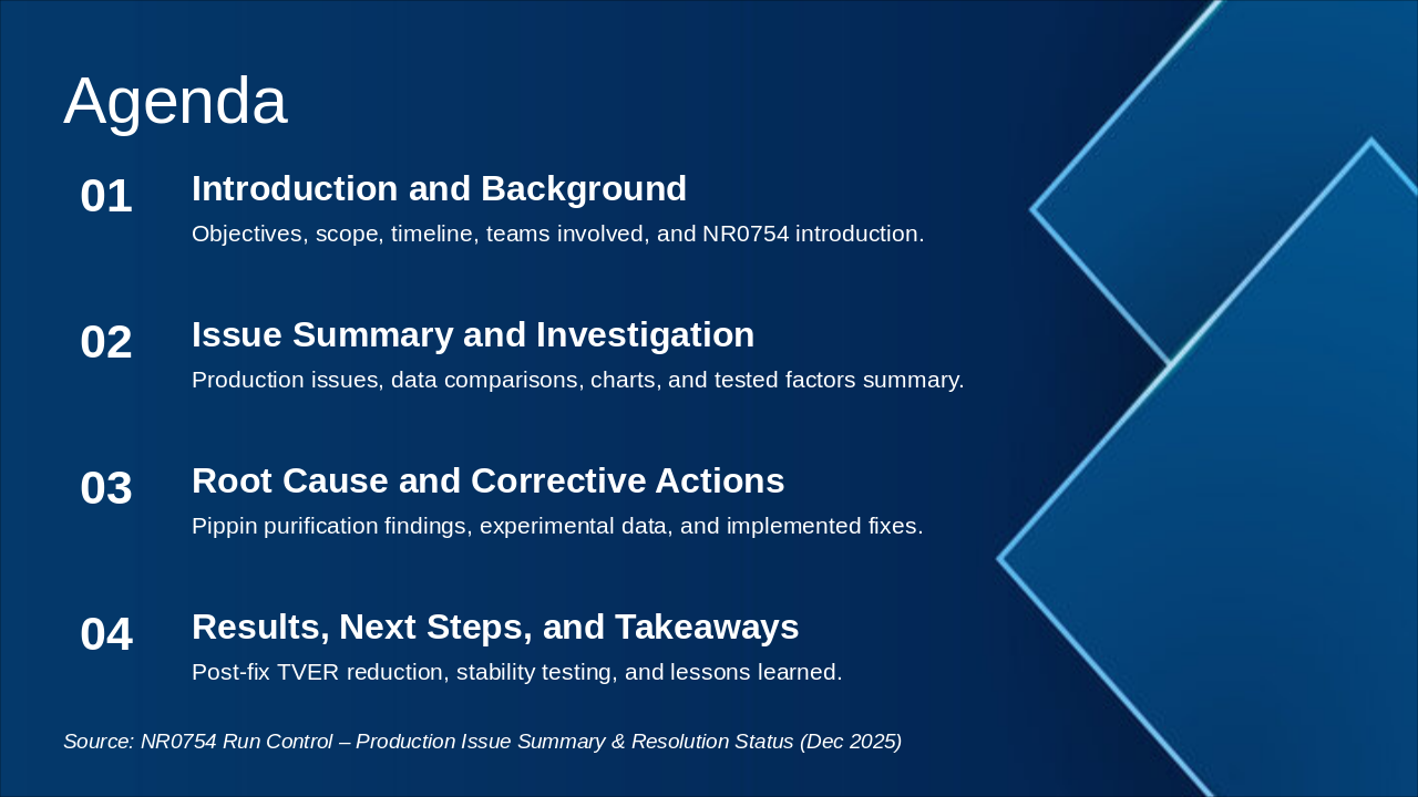 The agenda slide outlines a presentation on a production issue, starting with an introduction to objectives, scope, timeline, involved teams, and NR0754. It proceeds to summarize the issue investigation, root cause analysis with Pippin purification findings and fixes, and concludes with results like TVER reduction, next steps, stability testing, and key takeaways.