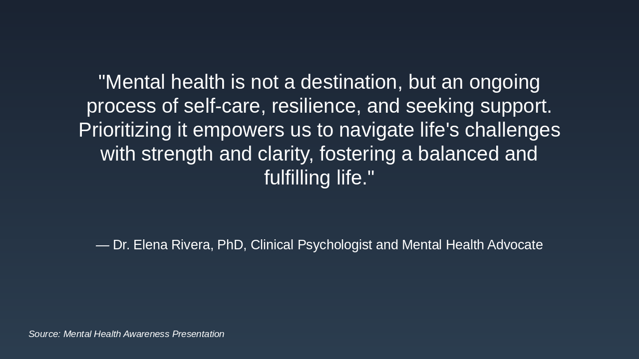 The slide features an inspiring quote on mental health, stating that it is an ongoing process of self-care, resilience, and seeking support, which empowers individuals to face life's challenges with strength and clarity for a balanced, fulfilling life. The quote is attributed to Dr. Elena Rivera, PhD, a clinical psychologist and mental health advocate.