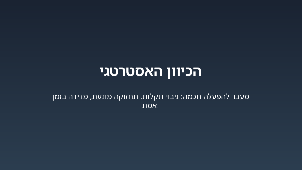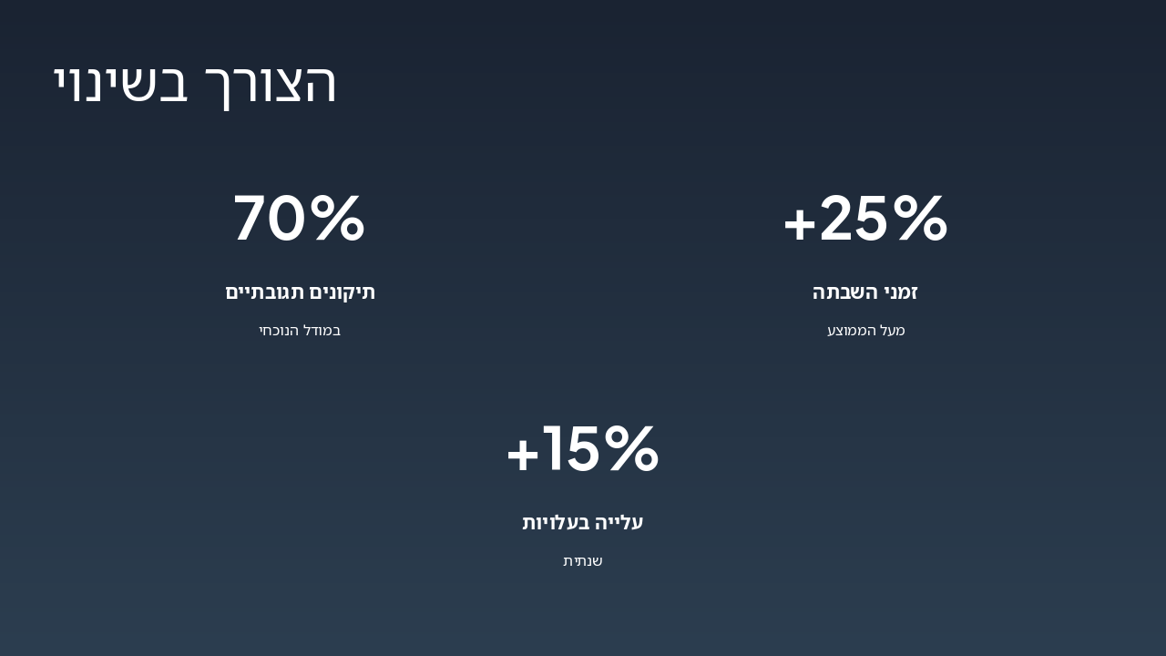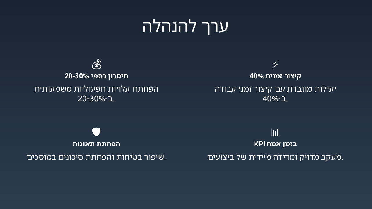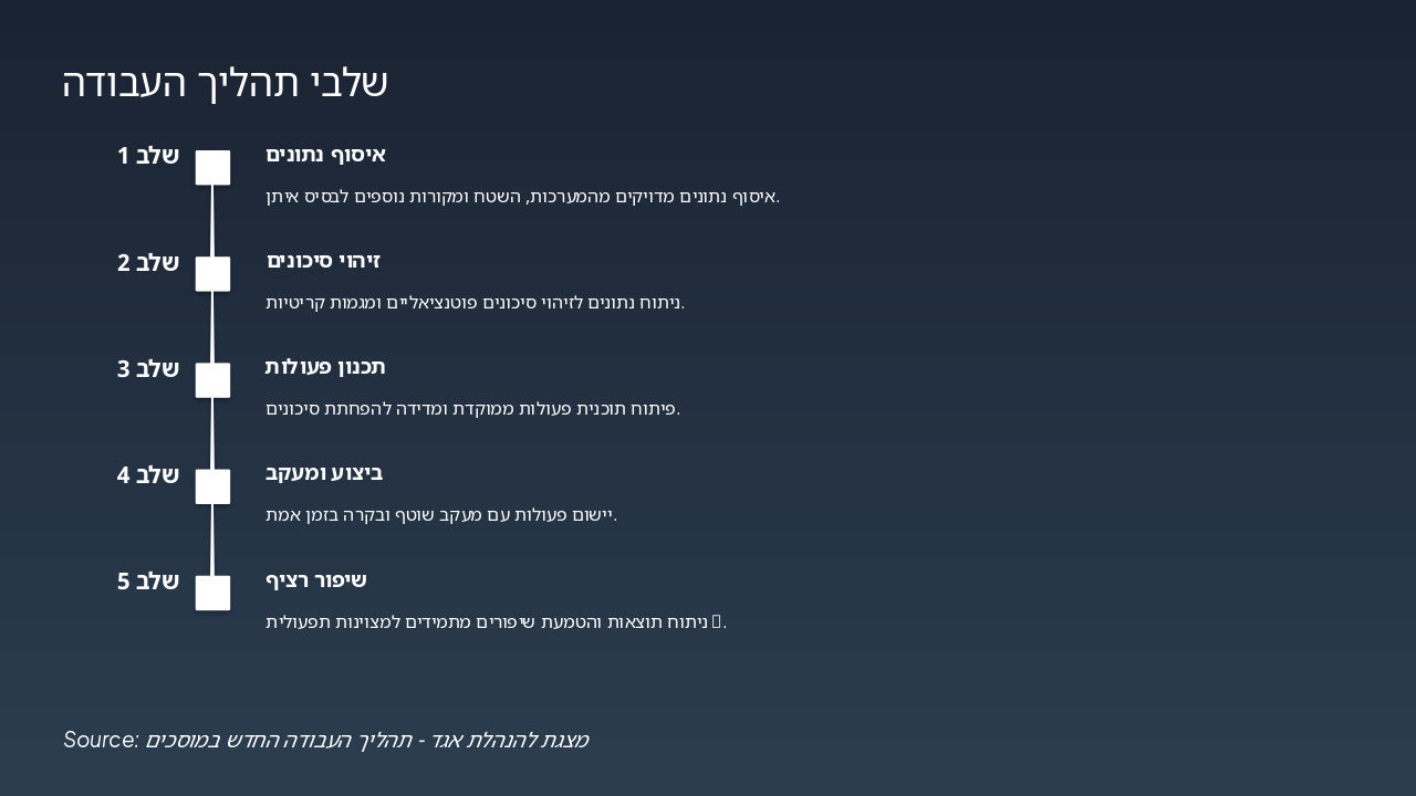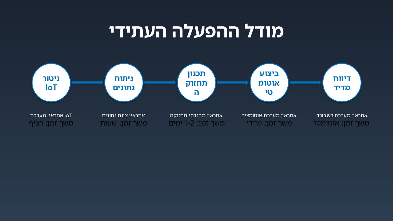 { "headers": [ "שלב", "אחראי", "משך זמן" ], "rows": [ [ "ניטור IoT", "מערכת IoT", "רציף" ], [ "ניתוח נתונים", "צוות נתונים", "שעות" ], [ "תכנון תחזוקה", "מהנדסי תחזוקה", "1-2 ימים" ], [ "ביצוע אוטומטי", "מערכת אוטומציה", "מיידי" ], [ "דיווח מדיד", "מערכת דשבורד", "אוטומטי" ] ] }
