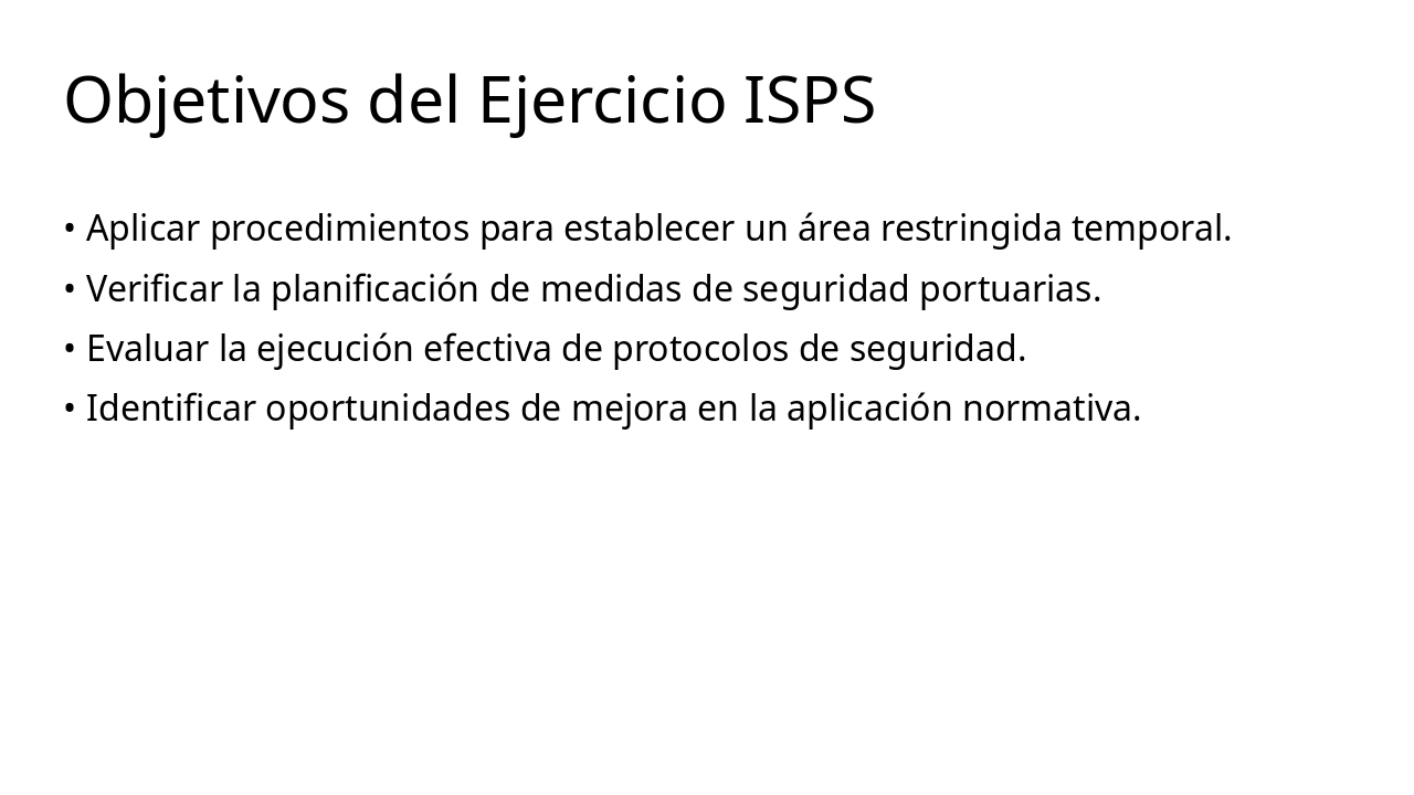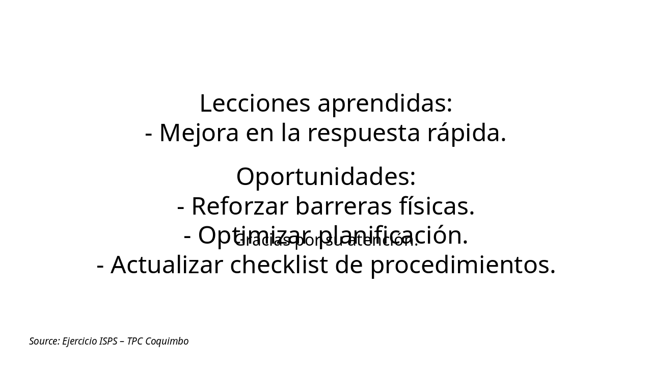 The title slide is titled "Ejercicio ISPS – TPC Coquimbo," focusing on an ISPS exercise at the TPC Coquimbo facility. It serves as an executive presentation, noting the location as TPC Coquimbo and the date as the current one to be inserted.