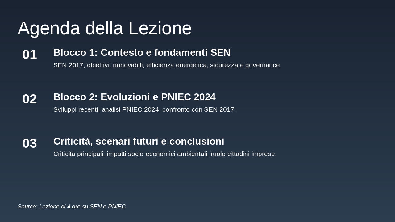 The lesson agenda outlines three blocks: Block 1 on the context and fundamentals of SEN 2017, covering objectives, renewables, energy efficiency, security, and governance; and Block 2 on recent evolutions, PNIEC 2024 analysis, and comparison with SEN 2017. The final block discusses key criticisms, future scenarios, conclusions, socio-economic and environmental impacts, and the role of citizens and businesses.