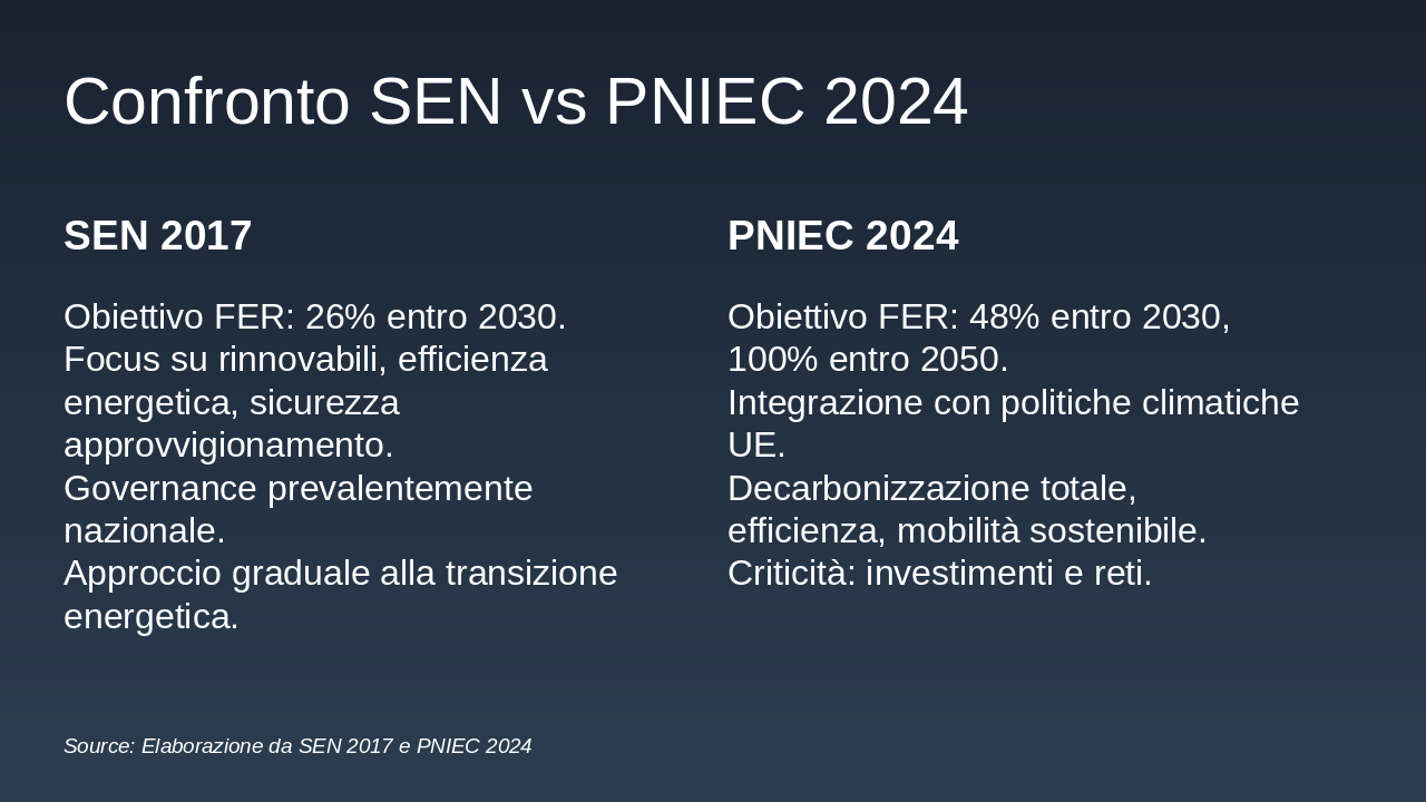 Sviluppi recenti, analisi PNIEC 2024, confronto con SEN 2017.