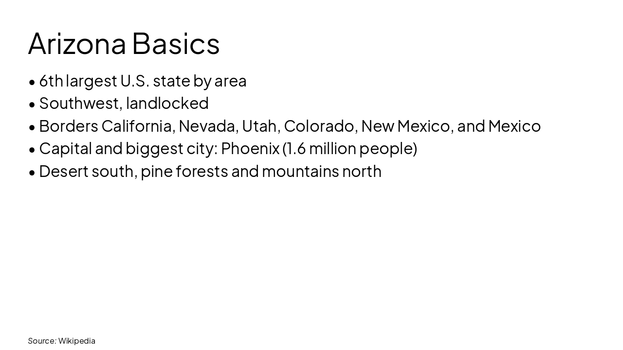 Build a presentation about a presentation I have to give to some 12 year olds in school about the state of Arizona.