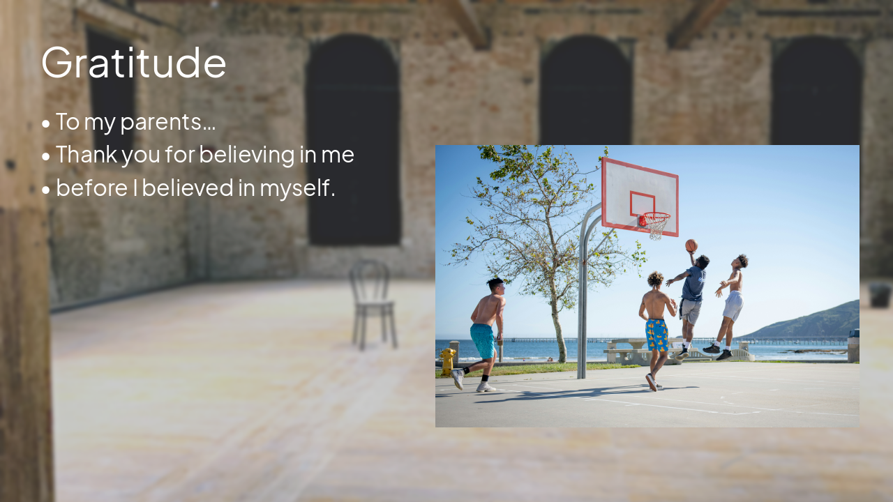 Make a presentation about Create a premium, competition-level presentation using Gamma AI. Topic: Basketball – More Than Just a Game Goal: Impress a judging panel with a highly emotional, visually cinematic, and impactful storytelling presentation. Design Direction: - Style: Cinematic, dramatic, high-end sports documentary - Color Palette: Deep black, dark gray, orange accents, subtle glow - Typography: Bold, modern (strong titles, minimal text) - Layout: Full-screen visuals with overlay text - Use contrast (light vs dark) to create emotional intensity - Keep text minimal, powerful, and memorable Storytelling Approach: - Build emotional progression: Passion → Struggle → Growth → Gratitude → Inspiration - Each slide should feel like a scene in a movie - Focus on impact, not information overload Slides Structure: Slide 1: Opening Impact Title: More Than Just a Game Subtitle: Basketball Text: "This is not just a sport… it's a way of life." Visual: Dramatic dunk under spotlight (dark background) Slide 2: The Feeling Text: - Passion - Fire - Energy "Basketball is emotion in motion." Visual: Intense game moment Slide 3: The Game Text: - Two teams - One goal - Every second matters Visual: Fast break action Slide 4: Discipline Text: - Control - Rules - Respect "Discipline creates greatness." Visual: Focused dribbling / close-up Slide 5: Teamwork Text: - Trust - Communication - Unity "No one wins alone." Visual: Team passing or celebrating Slide 6: The Struggle Text: - Hard work - Pain - Repetition "Behind every success… unseen effort." Visual: Player training alone at night Slide 7: The Example Text: Majd Arabsha "Success is built, not given." Visual: Determined athlete training Slide 8: My Story Text: "I didn’t walk this path alone." Visual: Emotional support moment Slide 9: Gratitude Text: "To my parents… Thank you for believing in me before I believed in myself." Visual: Family support / emotional scene Slide 10: Final Impact Text: "Basketball doesn’t build players… It builds people." Visual: Player standing strong Slide 11: Closing Text: Work hard. Believe. Never stop. Visual: Sunset silhouette with ball Advanced Instructions: - Use minimal words (maximum 5 words per line) - Add subtle animations (fade, zoom) - Sync visuals with emotional tone - Prioritize strong images over text - Make every slide feel like a powerful statement Presentation Style: - Confident, slow pacing - Strategic pauses after key lines - Let visuals speak This presentation must feel like a TED Talk combined with a Nike commercial.