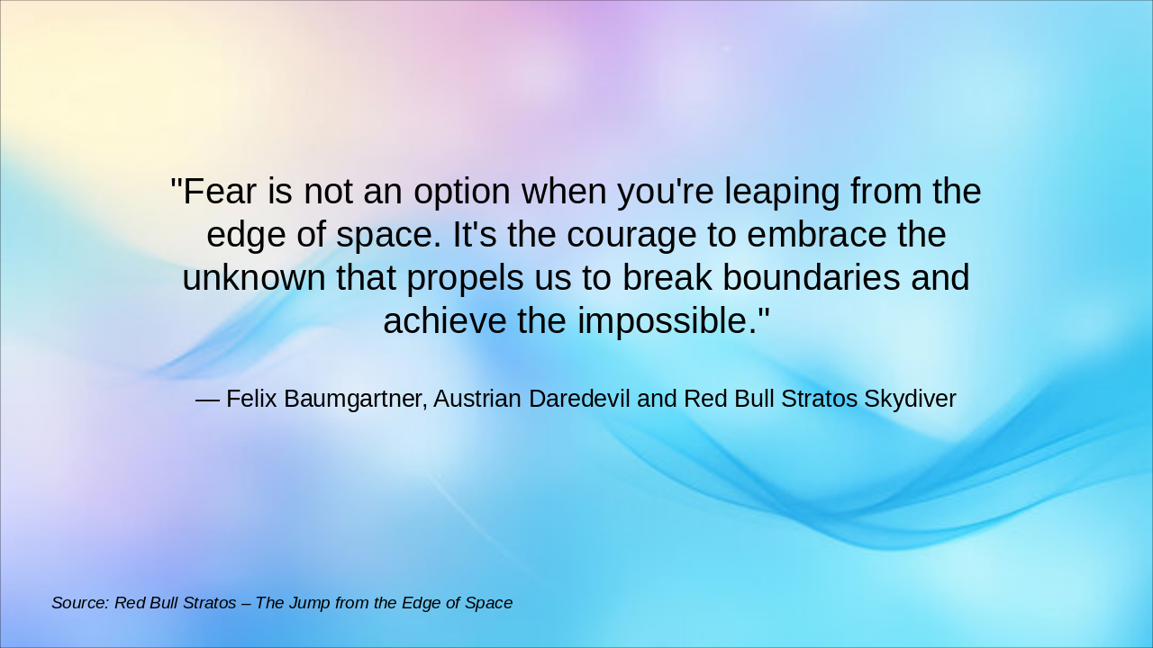The slide features a motivational quote from Felix Baumgartner, the Austrian daredevil known for his Red Bull Stratos space jump. In it, he states that fear has no place when leaping from space's edge, emphasizing how courage to embrace the unknown drives boundary-breaking achievements.