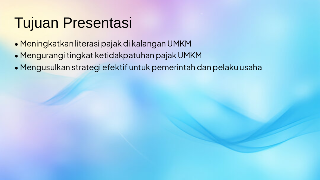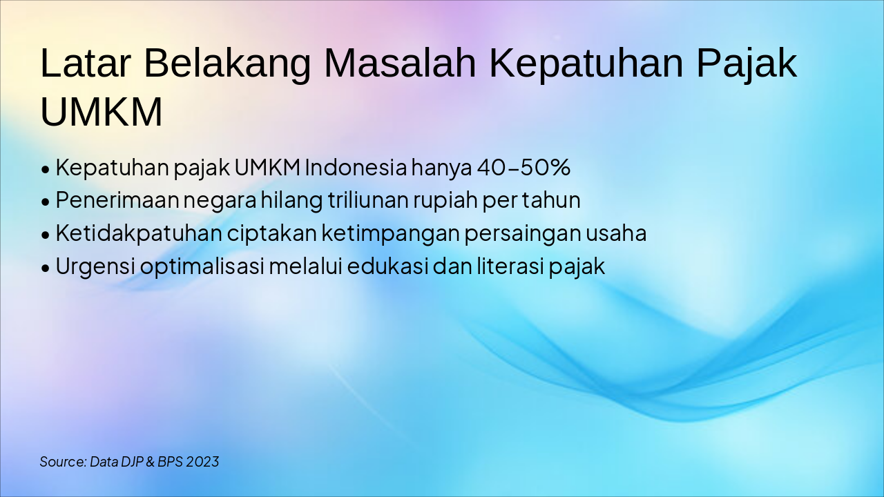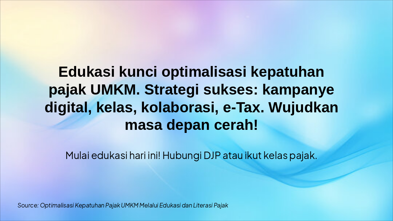 The "Strategi Optimalisasi" slide outlines four key strategies for enhancing tax compliance among UMKM: digital social media campaigns, free tax classes, DJP-UMKM collaborations, and user-friendly e-Tax technology. These features focus on making tax education engaging, boosting literacy, creating inclusive solutions, and simplifying reporting.