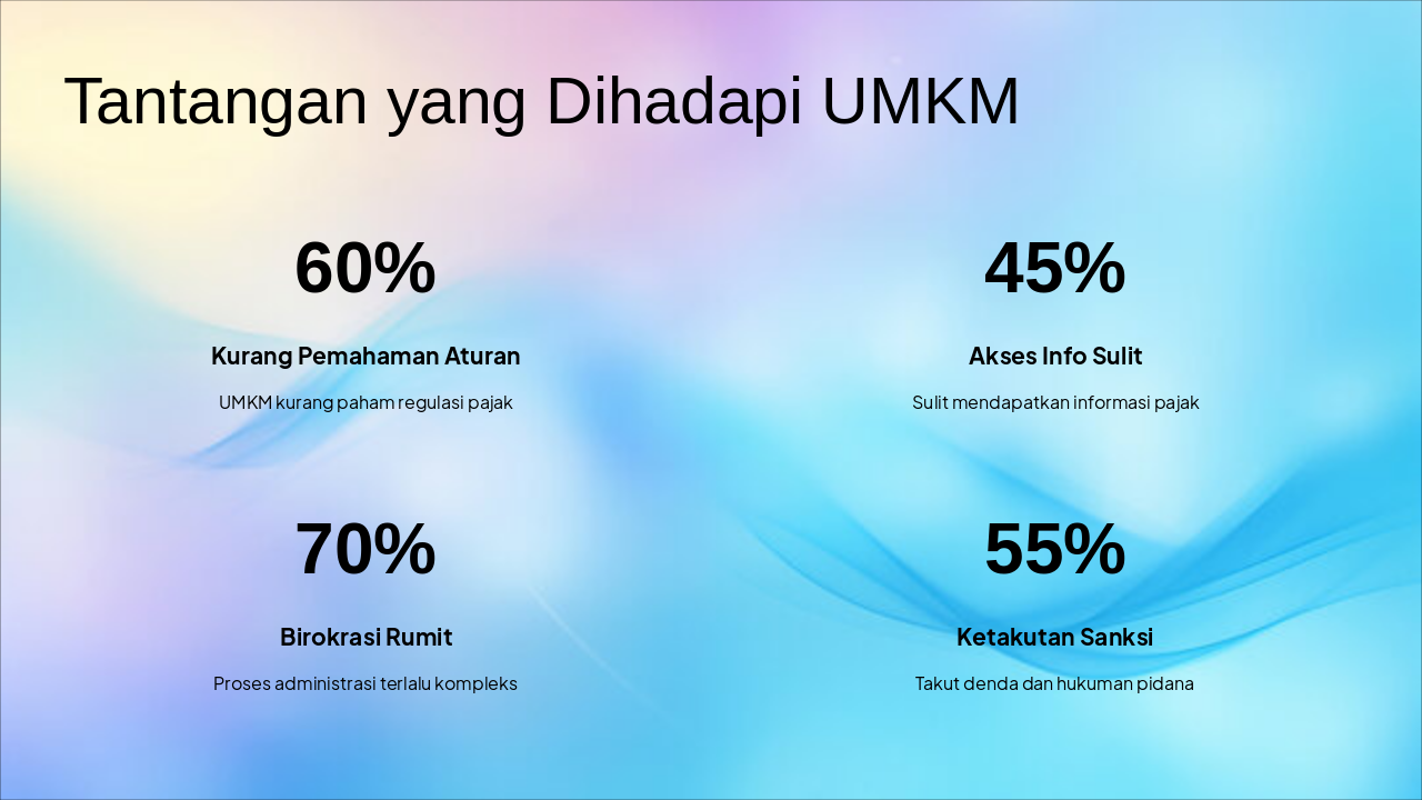 { "features": [ { "icon": "📱", "heading": "Kampanye Digital Medsos", "description": "Melalui kampanye digital di medsos, edukasi pajak menjadi lebih menarik bagi UMKM." }, { "icon": "📚", "heading": "Kelas Pajak Gratis", "description": "Menyelenggarakan kelas pajak gratis untuk tingkatkan literasi dan pemahaman UMKM." }, { "icon": "🤝", "heading": "Kolaborasi DJP-UMKM", "description": "Kerjasama DJP dan UMKM ciptakan solusi pajak inklusif dan relevan." }, { "icon": "💻", "heading": "Teknologi e-Tax Mudah", "description": "Aplikasi e-Tax user-friendly mudahkan pelaporan pajak bagi UMKM kecil." } ] }