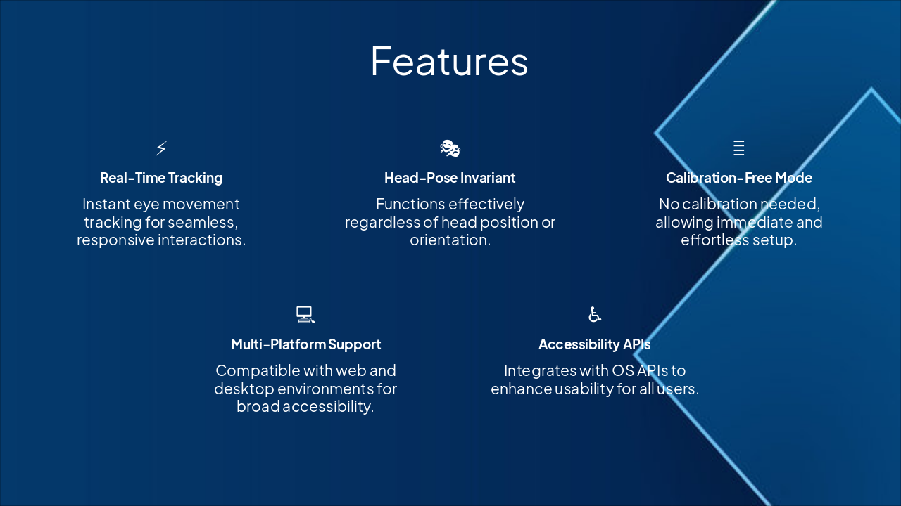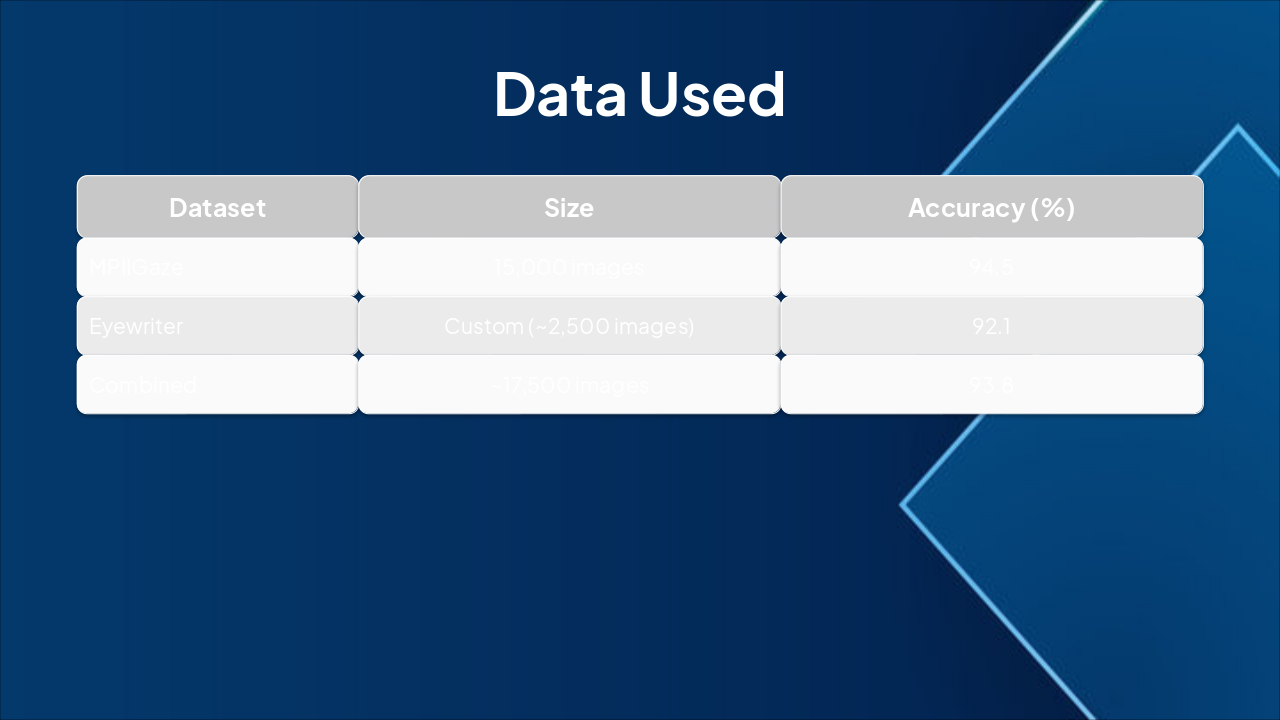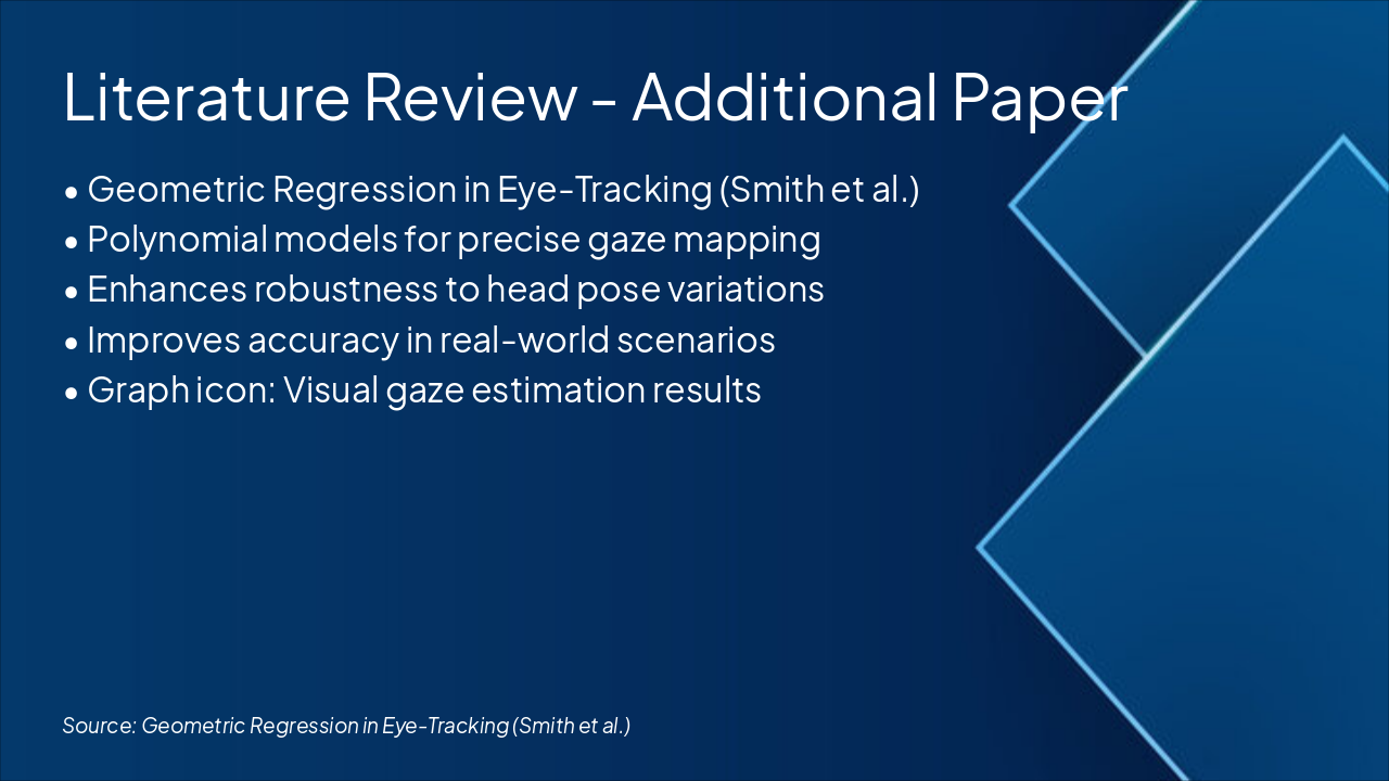 { "headers": [ "Step", "Description", "Technology" ], "rows": [ [ "1. Eye/Pupil Detection", "Detect eyes and pupils from real-time video input", "YOLOv5" ], [ "2. Gaze Vector Estimation", "Compute 3D gaze direction vector from eye images", "CNN" ], [ "3. Point-of-Regard Prediction", "Map gaze vector to 2D screen coordinates", "Polynomial Regression" ], [ "4. Smoothing & Output", "Apply temporal filtering for stable gaze tracking", "Kalman Filter" ] ] }