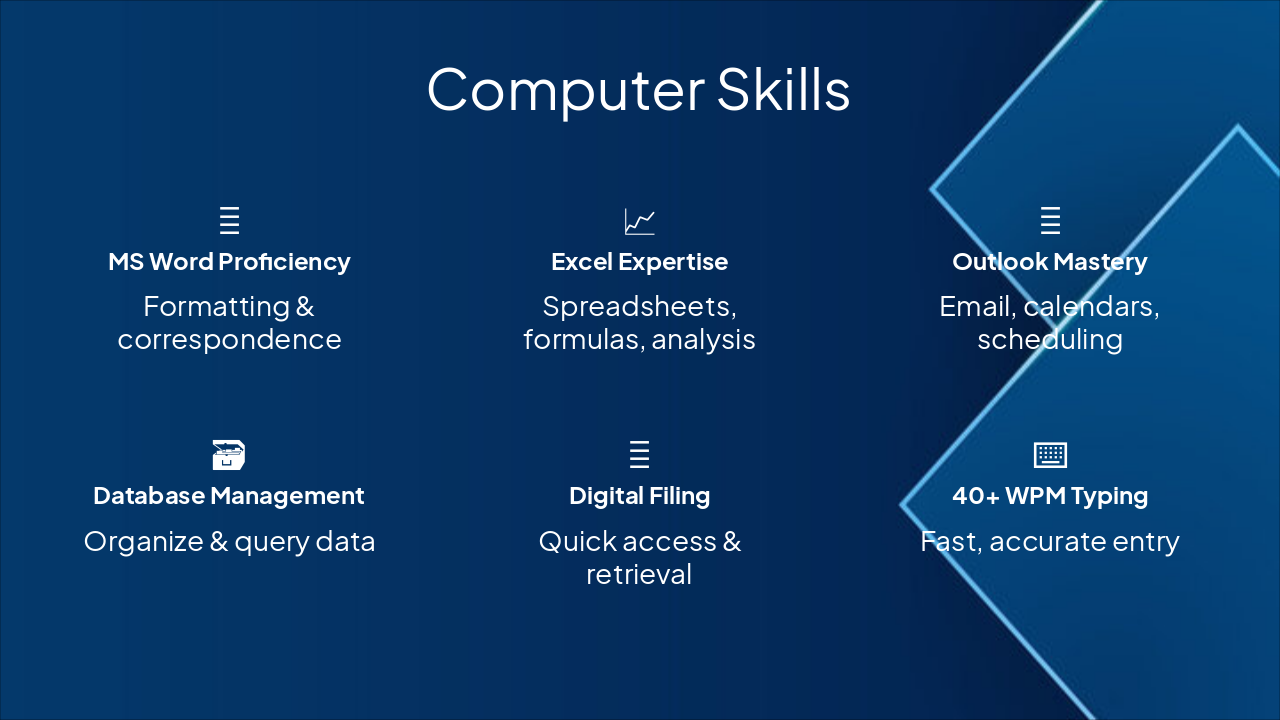 Create a 6-slide presentation titled 'Thank You – Why I’m the Perfect Fit for the Administrative Assistant Role' for a job interview follow-up to the Drug Programs Policy and Strategy Branch, Ministry of Health. Use a professional blue theme. One slide per skill: Slide 1: Title Slide – include name, role, and a short thank-you message expressing enthusiasm for contributing to the Ministry of Health’s mission. Slide 2: Administrative Knowledge – highlight experience managing mail, records, invoices, HR coordination, and preparing reports and correspondence. Slide 3: Organizational, Problem-Solving & Analytical Skills – emphasize ability to coordinate meetings, prioritize competing deadlines, improve processes, and ensure accuracy. Slide 4: Computer Skills – describe proficiency in Microsoft Word, Excel, Outlook, database management, and digital filing systems; note typing speed (40+ WPM). Slide 5: Communication & Interpersonal Skills – show examples of professional communication, teamwork, and collaboration with staff and partners. Slide 6: Closing & Appreciation – express gratitude for the interview opportunity, restate enthusiasm for supporting the Branch’s mission, and thank the panel for their time.