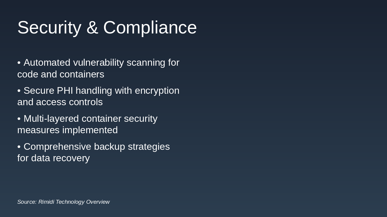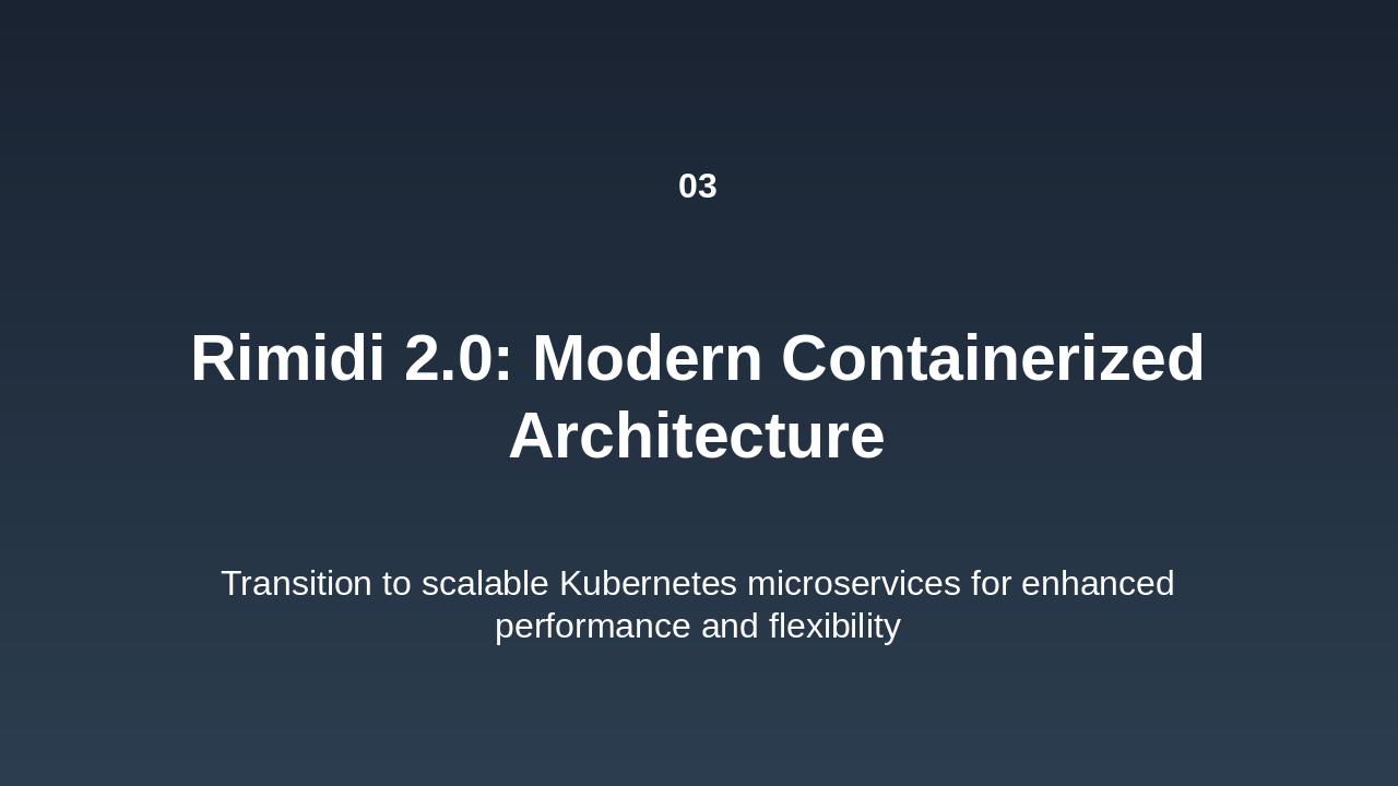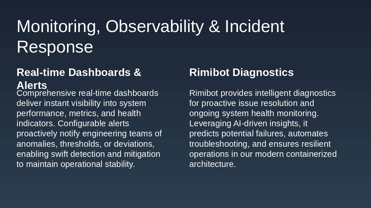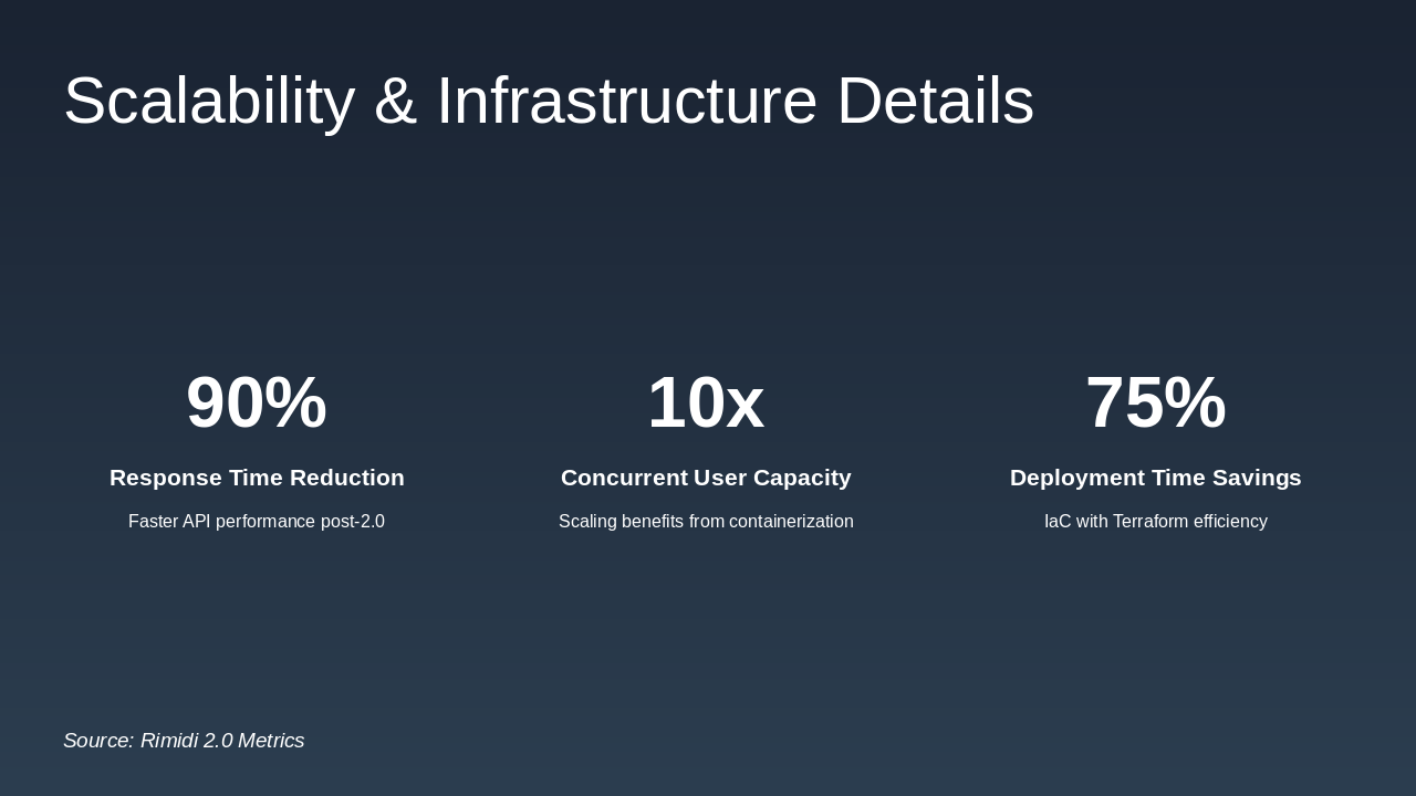 Detail Rimidi 2.0, core integrations, DevOps, scalability, and monitoring.
