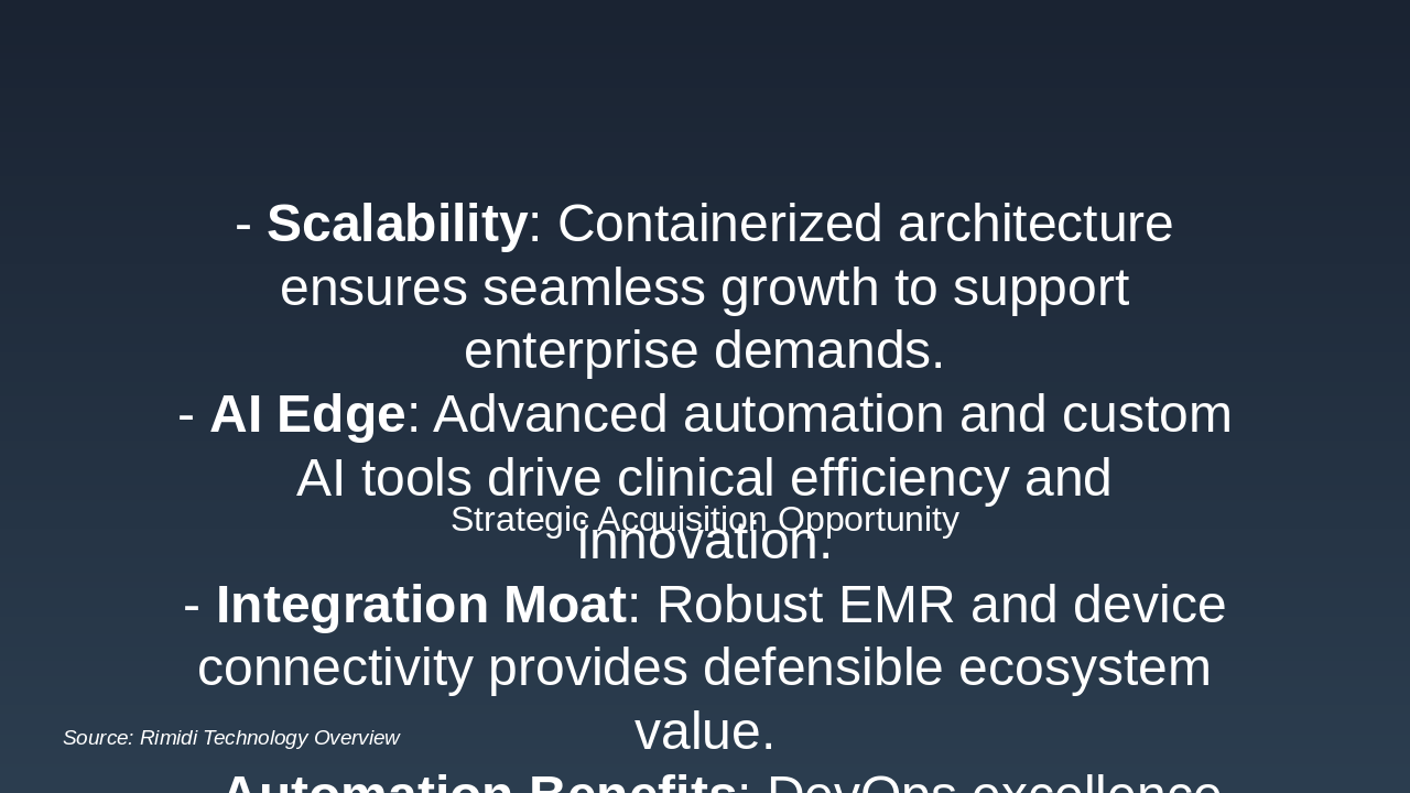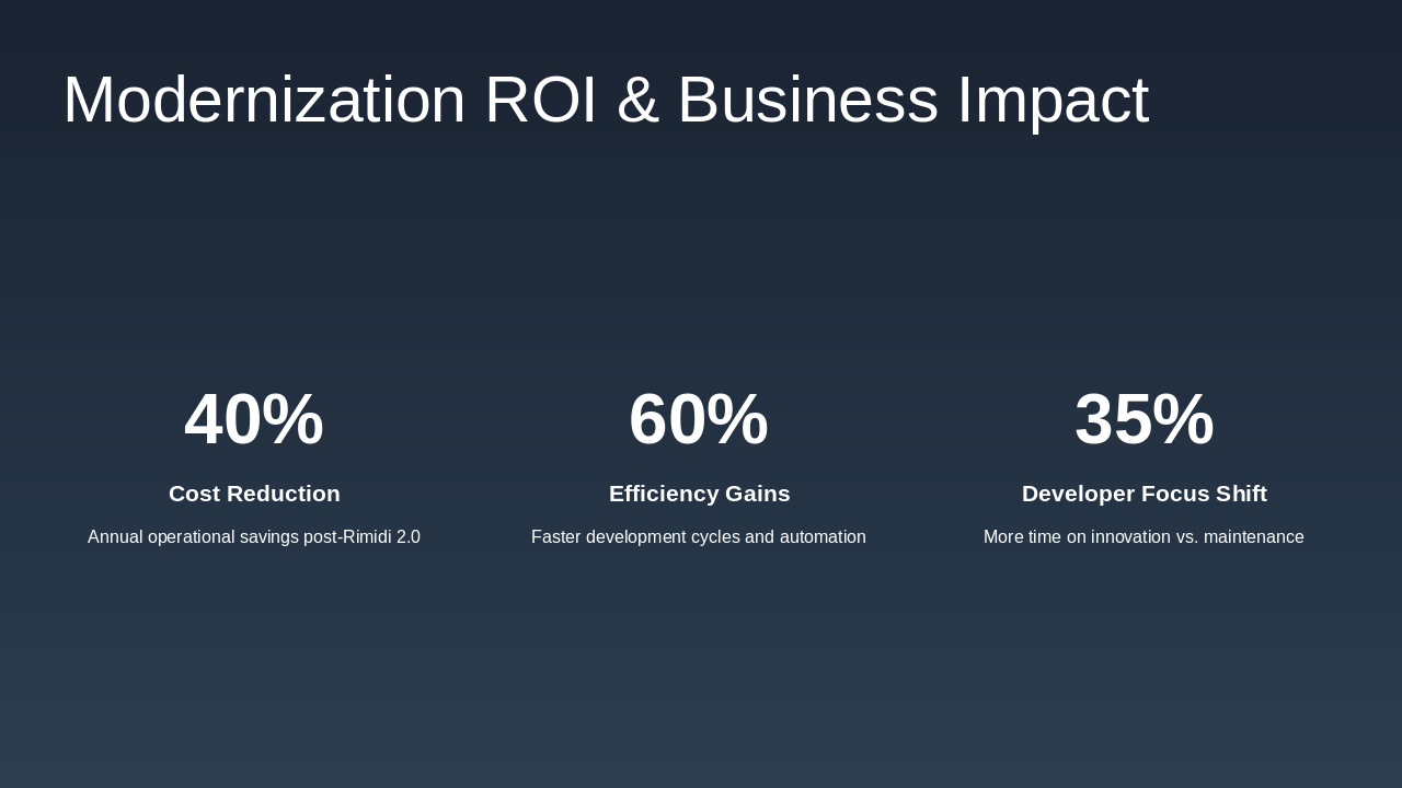 Quantify modernization impacts and strategic benefits for acquirers. Source: Rimidi Technology Overview