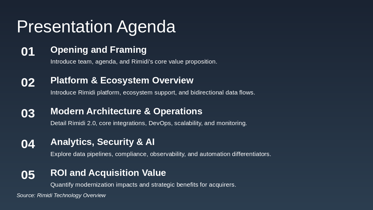 This agenda slide outlines the high-level structure to guide the audience through the technical depth and business value of Rimidi's platform, emphasizing modernization and acquisition appeal.