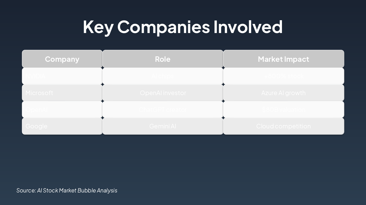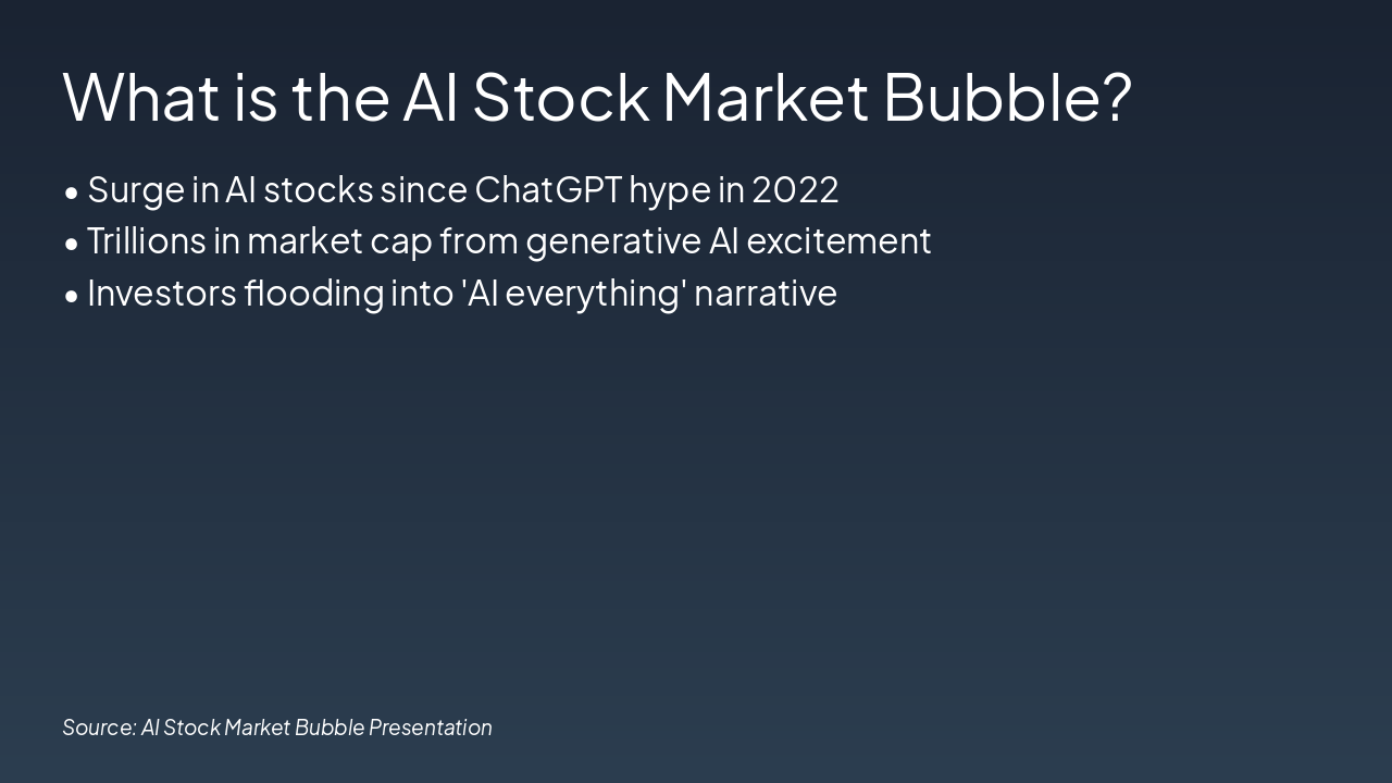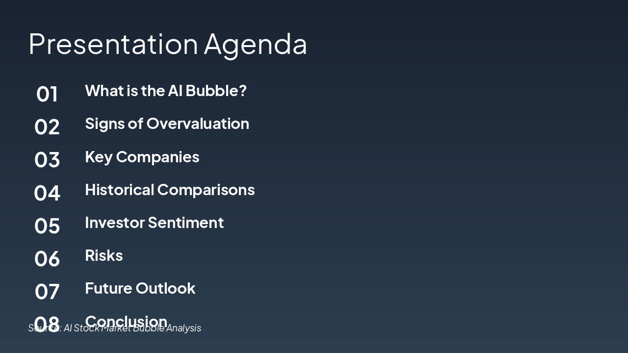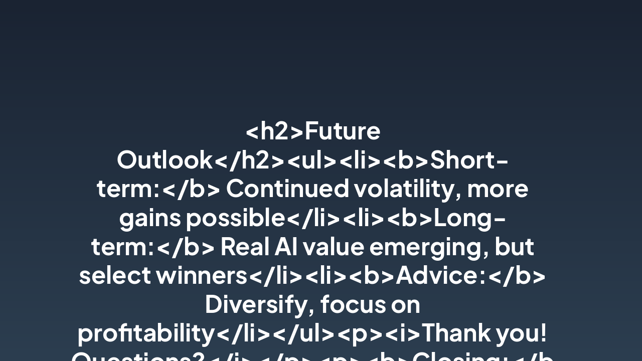 <h2>Future Outlook</h2><ul><li><b>Short-term:</b> Continued volatility, more gains possible</li><li><b>Long-term:</b> Real AI value emerging, but select winners</li><li><b>Advice:</b> Diversify, focus on profitability</li></ul><p><i>Thank you! Questions?</i></p><p><b>Closing:</b> Navigate AI wisely.</p><p><b>Call-to-Action:</b> Diversify your portfolio and prioritize profitability today.</p>
