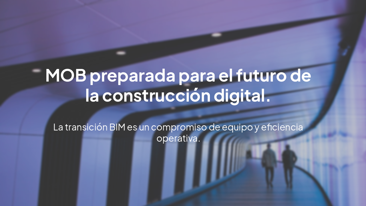 Estrategia de transformación digital mediante BIM en MOB. Cubre visión general, metodología de flujos de trabajo, estandarización LOIN (LOD), pilares clave y hoja de ruta para digitalización, compatibilización y eficiencia operativa en construcción.