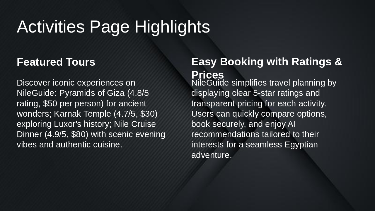 The slide titled "NileGuide: Discover Egypt with AI" introduces an innovative AI platform designed to provide personalized travel experiences. It highlights NileGuide's focus on exploring Egypt's iconic sites through tailored recommendations.