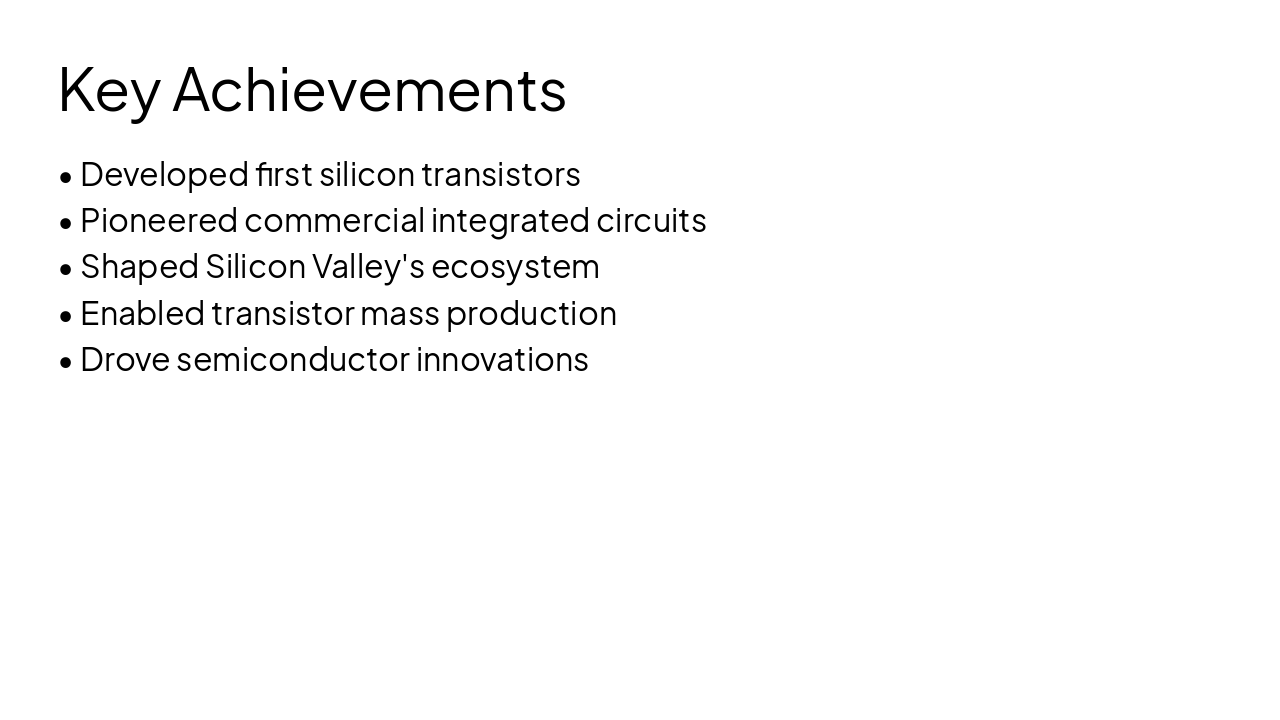 1957: Founded from Shockley Lab Traitorous Eight established Fairchild Semiconductor in California. 1960s: Pioneered IC Manufacturing First to mass-produce integrated circuits, transforming electronics. 1979: Schlumberger Acquisition Acquired by Schlumberger Ltd. for $425 million. 1987: National Semiconductor Buyout Purchased by National Semiconductor during industry shifts. 1997: Regained Independence Spun off to operate autonomously once more.