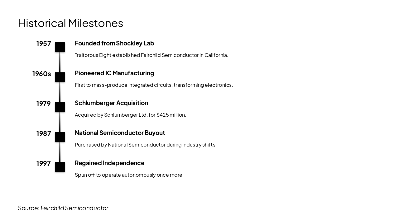 Fairchild Semiconductor was founded in 1957 by the Traitorous Eight from Shockley Lab and pioneered mass-production of integrated circuits in the 1960s. It was acquired by Schlumberger in 1979, bought by National Semiconductor in 1987, and spun off to regain independence in 1997.