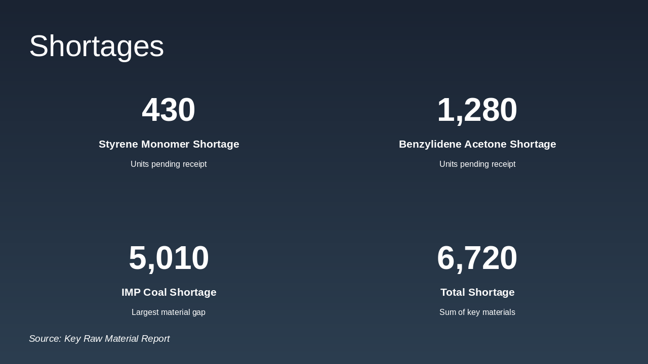 The slide details key material shortages: 430 units of Styrene Monomer and 1,280 units of Benzylidene Acetone pending receipt, plus 5,010 units of IMP Coal as the largest gap. The total shortage across these materials is 6,720 units.