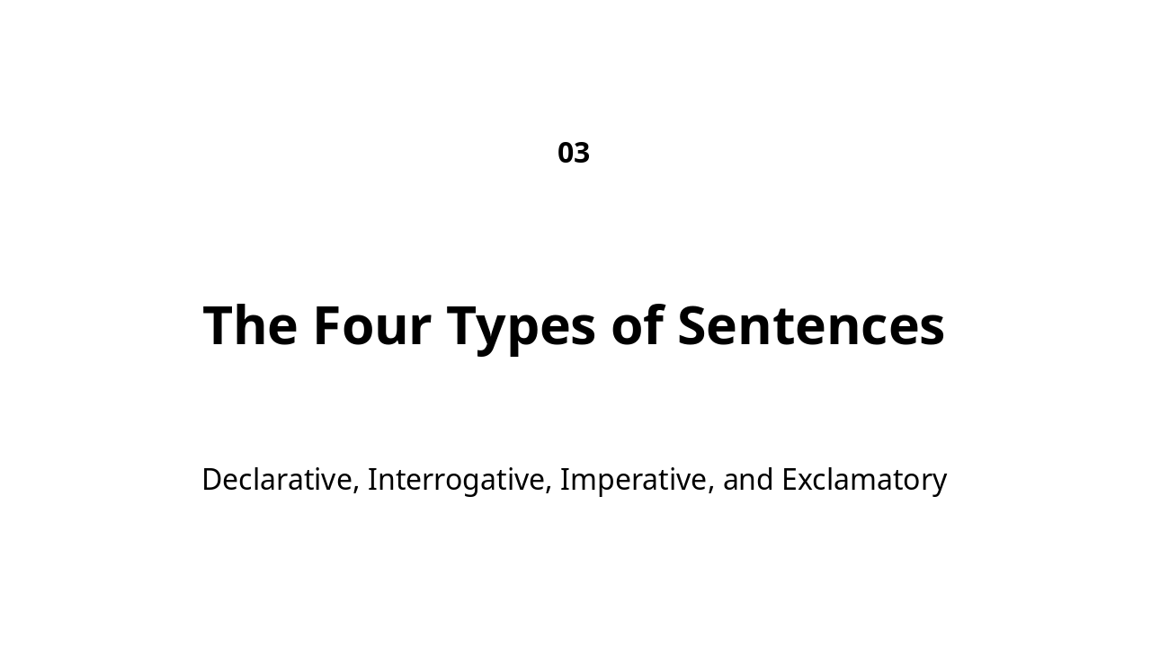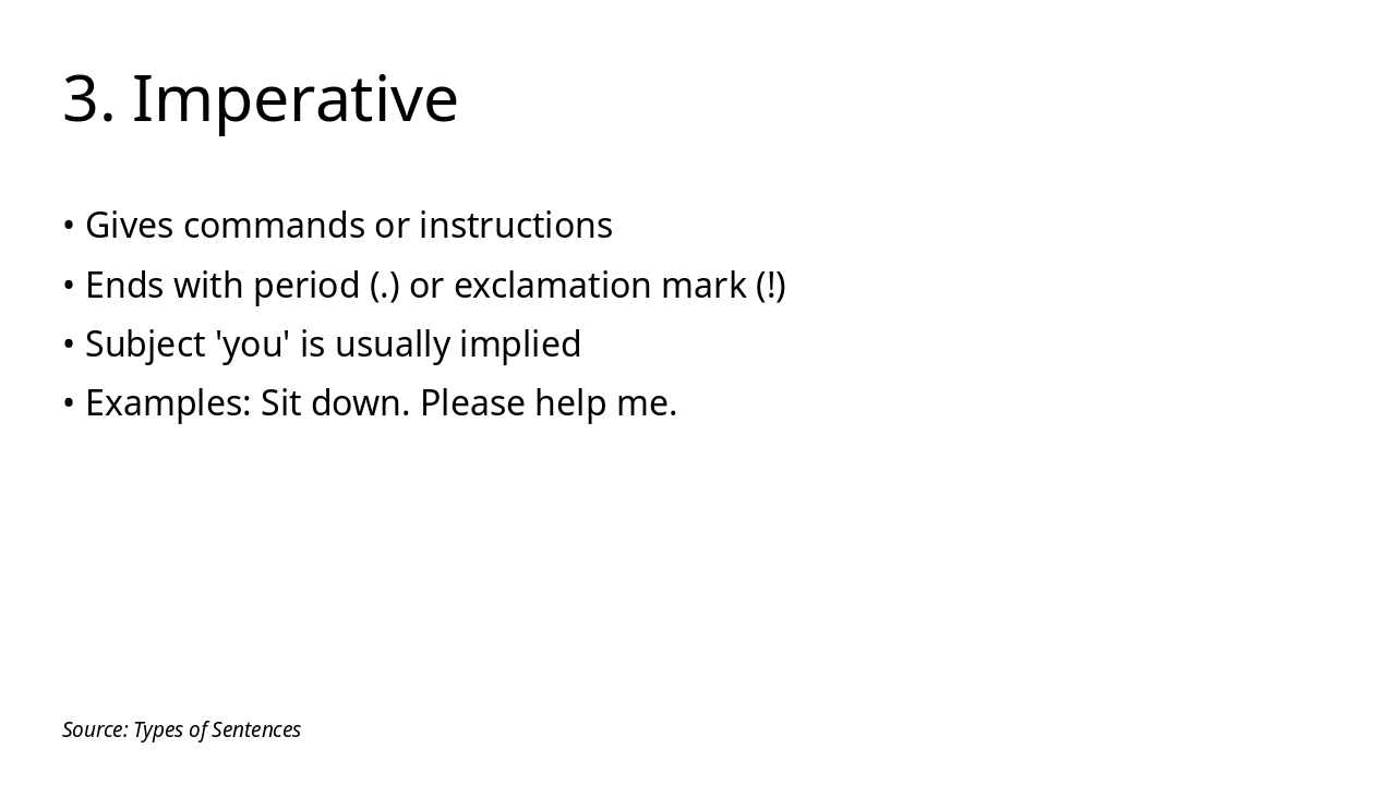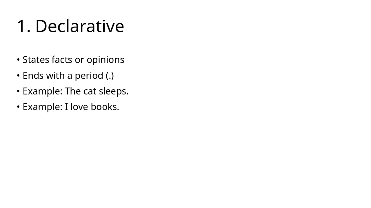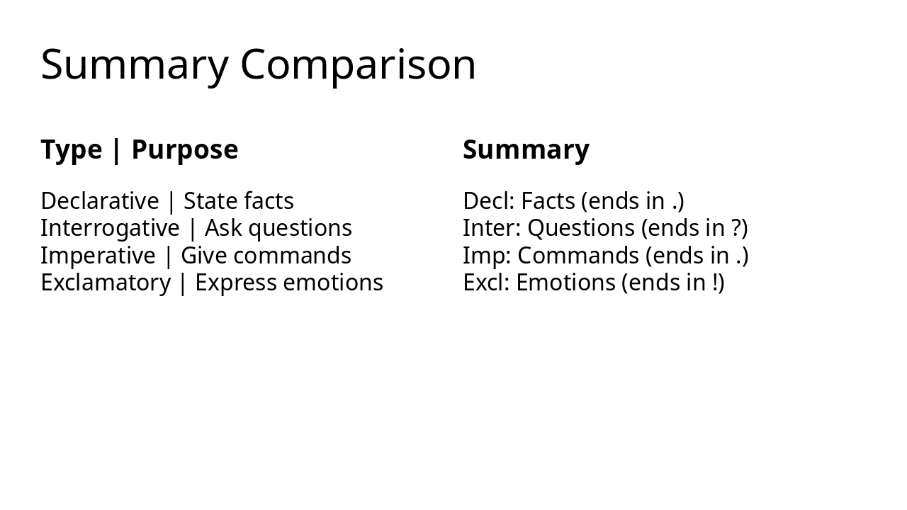 | Declarative | State facts Interrogative | Ask questions Imperative | Give commands Exclamatory | Express emotions | Decl: Facts (ends in .) Inter: Questions (ends in ?) Imp: Commands (ends in .) Excl: Emotions (ends in !) |