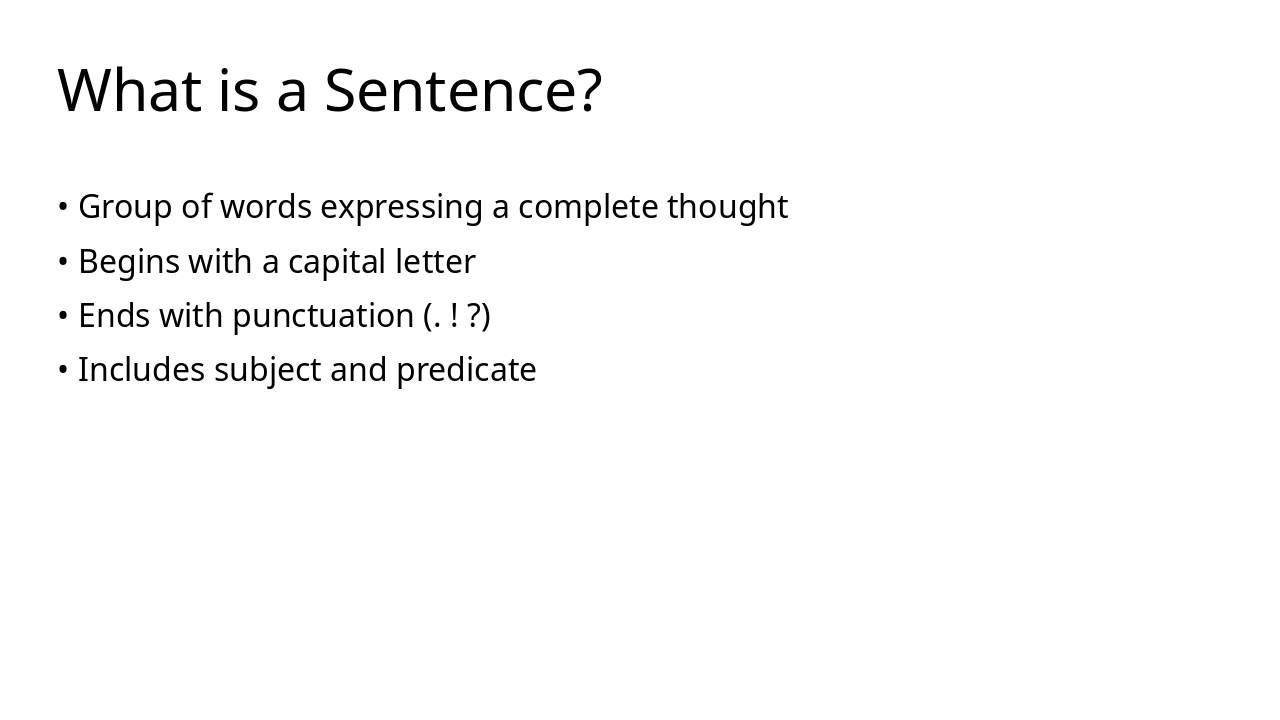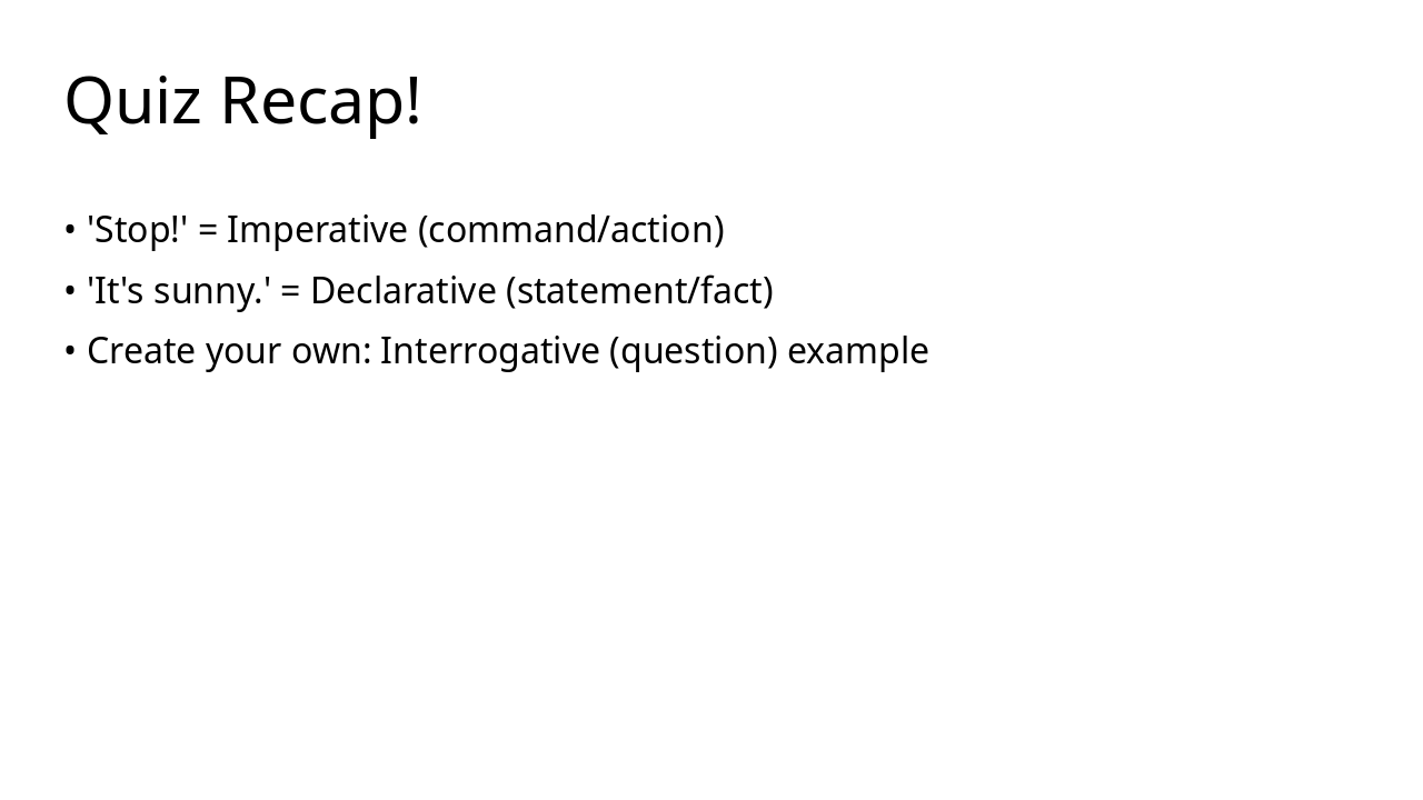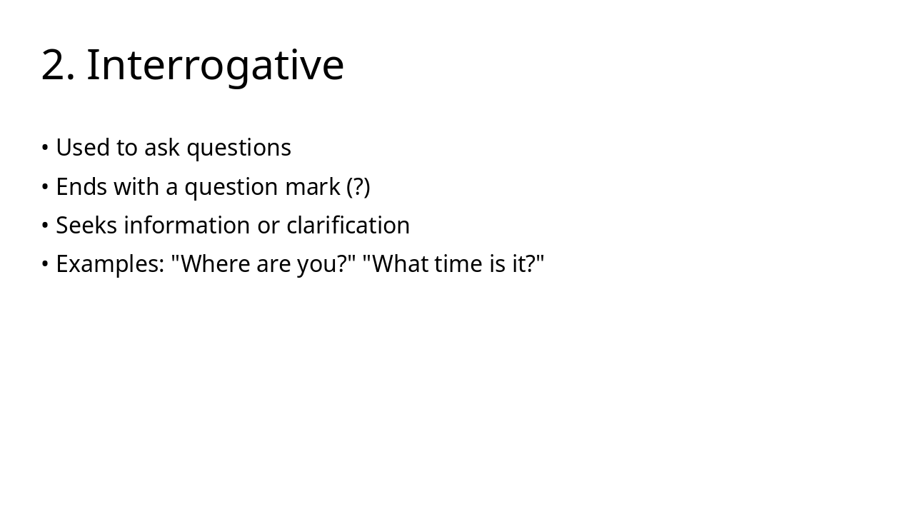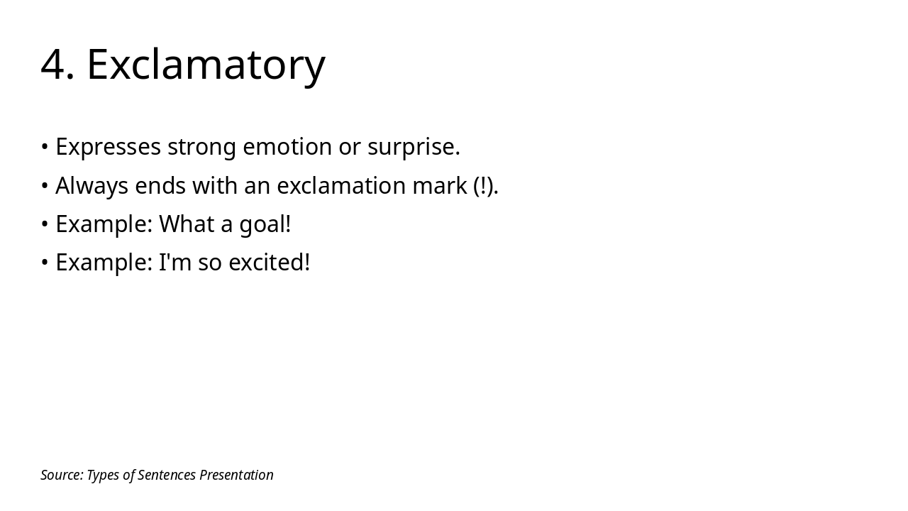 | Declarative | State facts Interrogative | Ask questions Imperative | Give commands Exclamatory | Express emotions | Decl: Facts (ends in .) Inter: Questions (ends in ?) Imp: Commands (ends in .) Excl: Emotions (ends in !) |