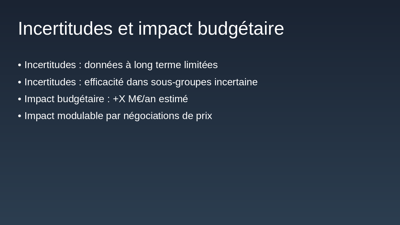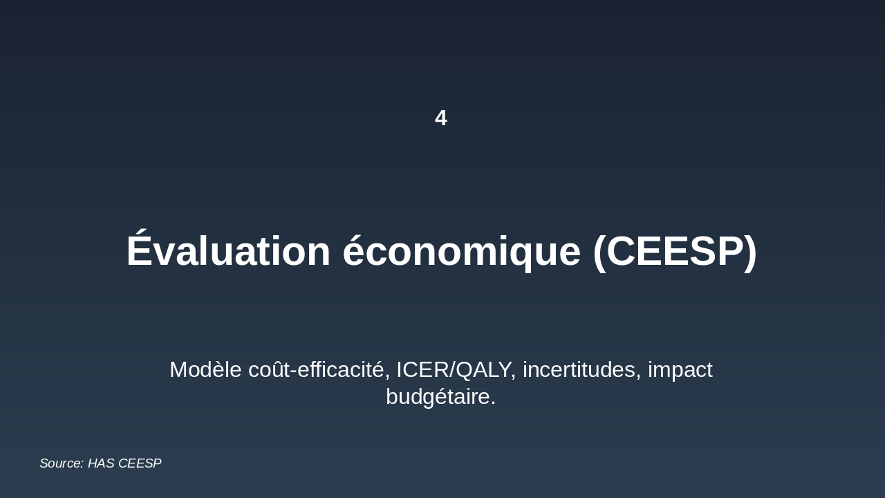 Modèle, ICER/QALY, incertitudes, impact budgétaire.