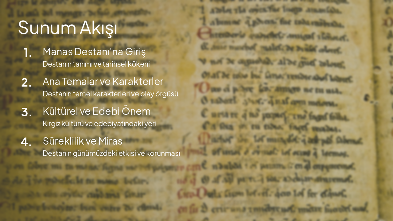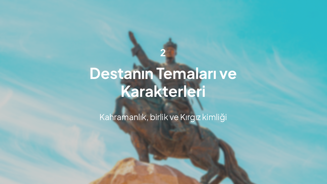Bu sunum, Kırgız halkının en önemli sözlü epik geleneği Manas Destanı'nı tanıtır. Tarihsel kökenleri, ana temaları, karakterleri, kültürel ve edebi önemi ile günümüzdeki mirası ve sürekliliği ele alınır.