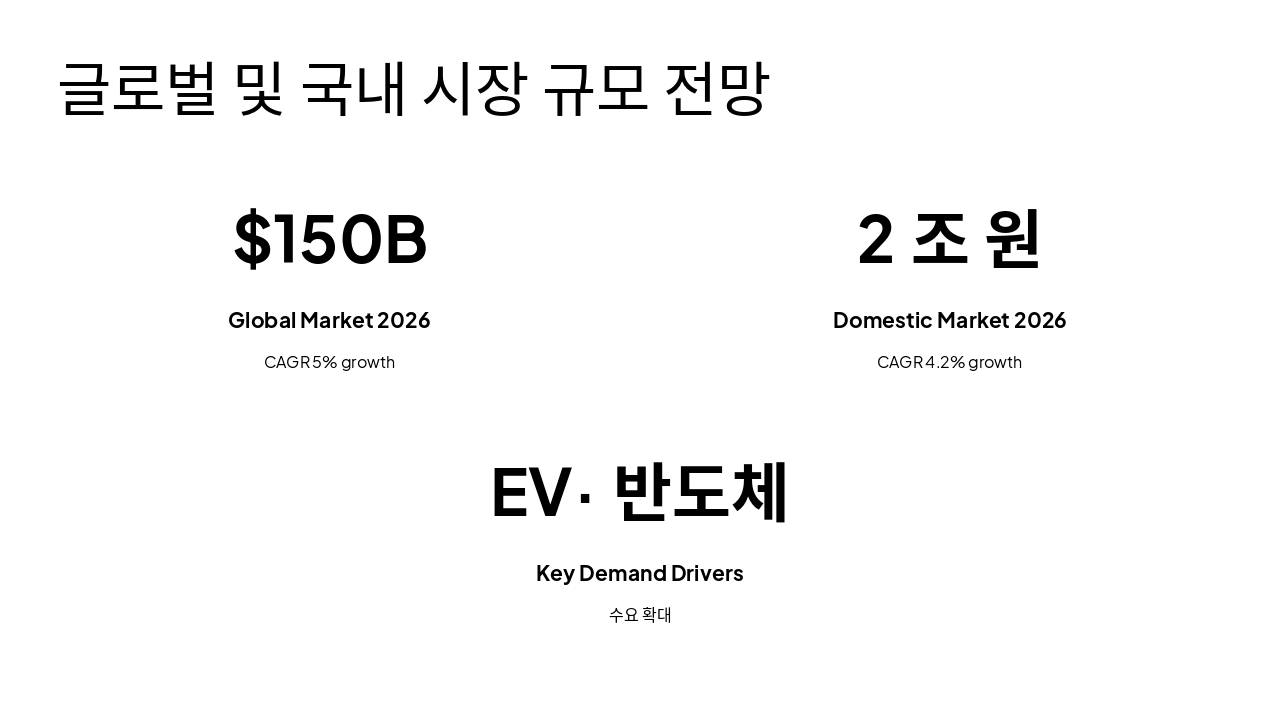 2026년 글로벌 시장 규모는 1500억 달러로 CAGR 5% 성장할 전망이다. 국내 시장은 2조 원 규모로 CAGR 4.2% 성장하며, EV·반도체가 주요 수요 동력이다.